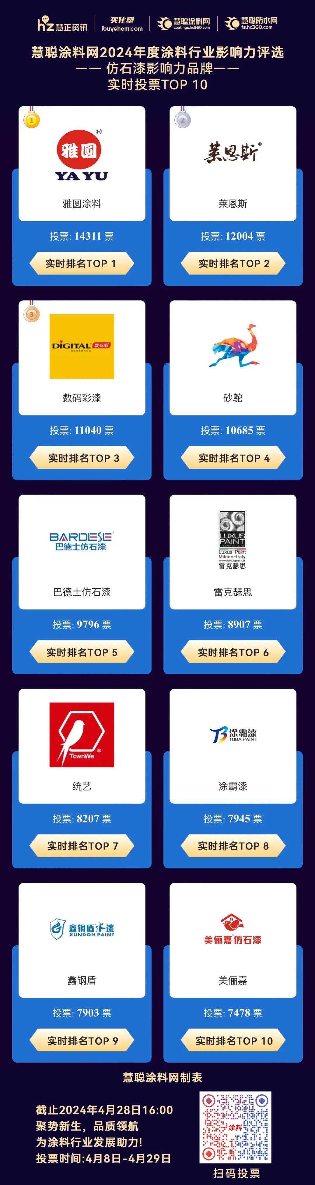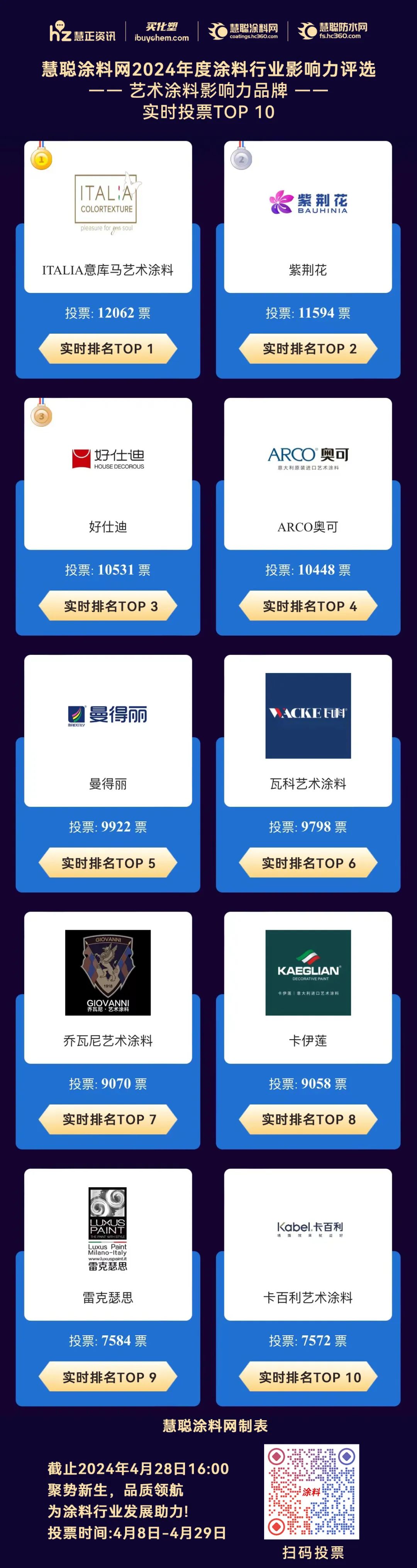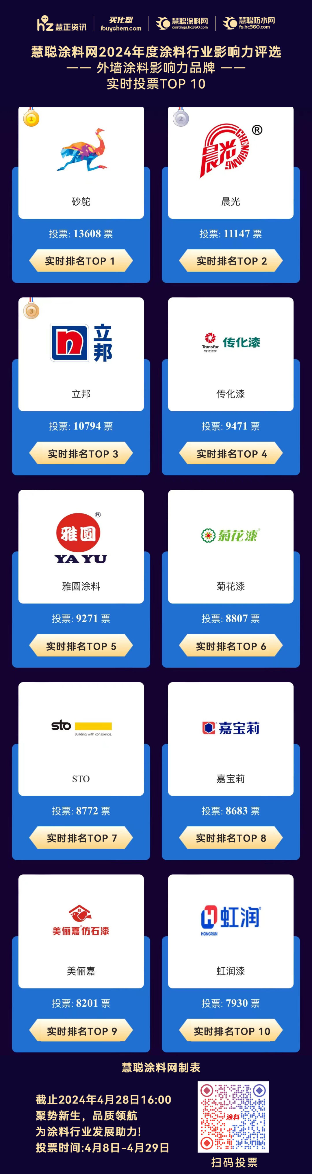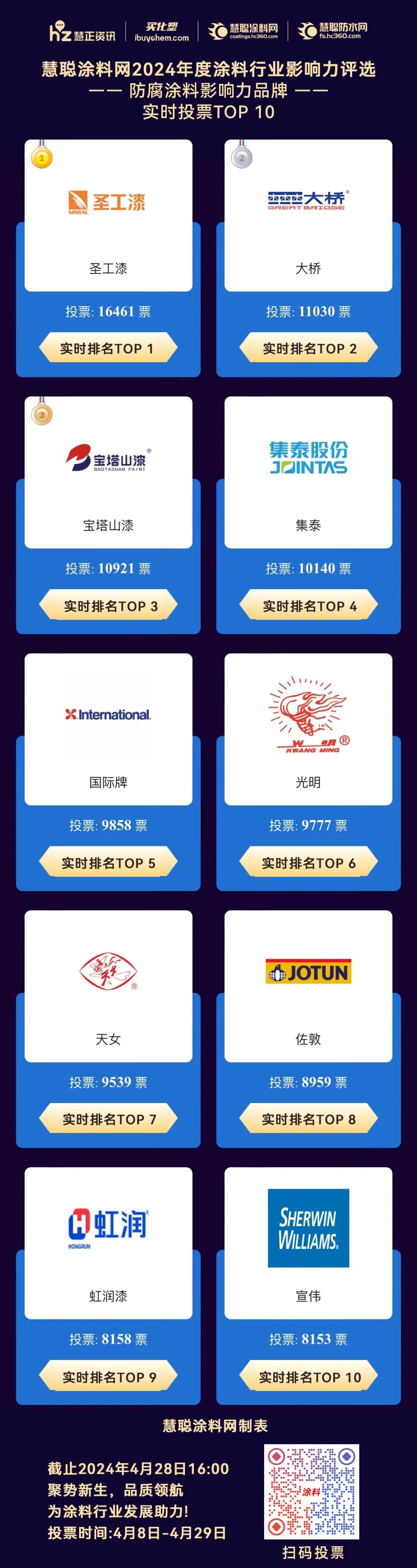 截止4月28日16:00,“2024年度第十九届涂料行业影响力品牌评选活动”各奖项投票排名前十的企业播报:
