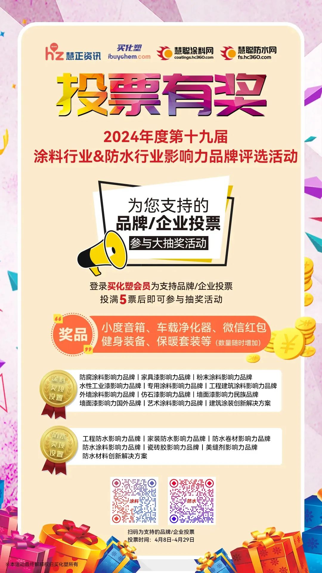 此次活动汇聚了涂料行业的众多佼佼者,他们各自凭借着卓越的产品质量、创新的技术实力以及广泛的市场认可度,从4月8日持续到4月29日,您每天可为心目中的优秀品牌投上宝贵的1票,登陆买化塑或者慧正资讯会员,每天可投5票,助力您支持的品牌/企业进入20强。您所投出的每一票对参选企业都弥足珍贵。为了您支持的涂料品牌顺利晋级,赶紧为您喜爱的涂料品牌投上宝贵的一票!