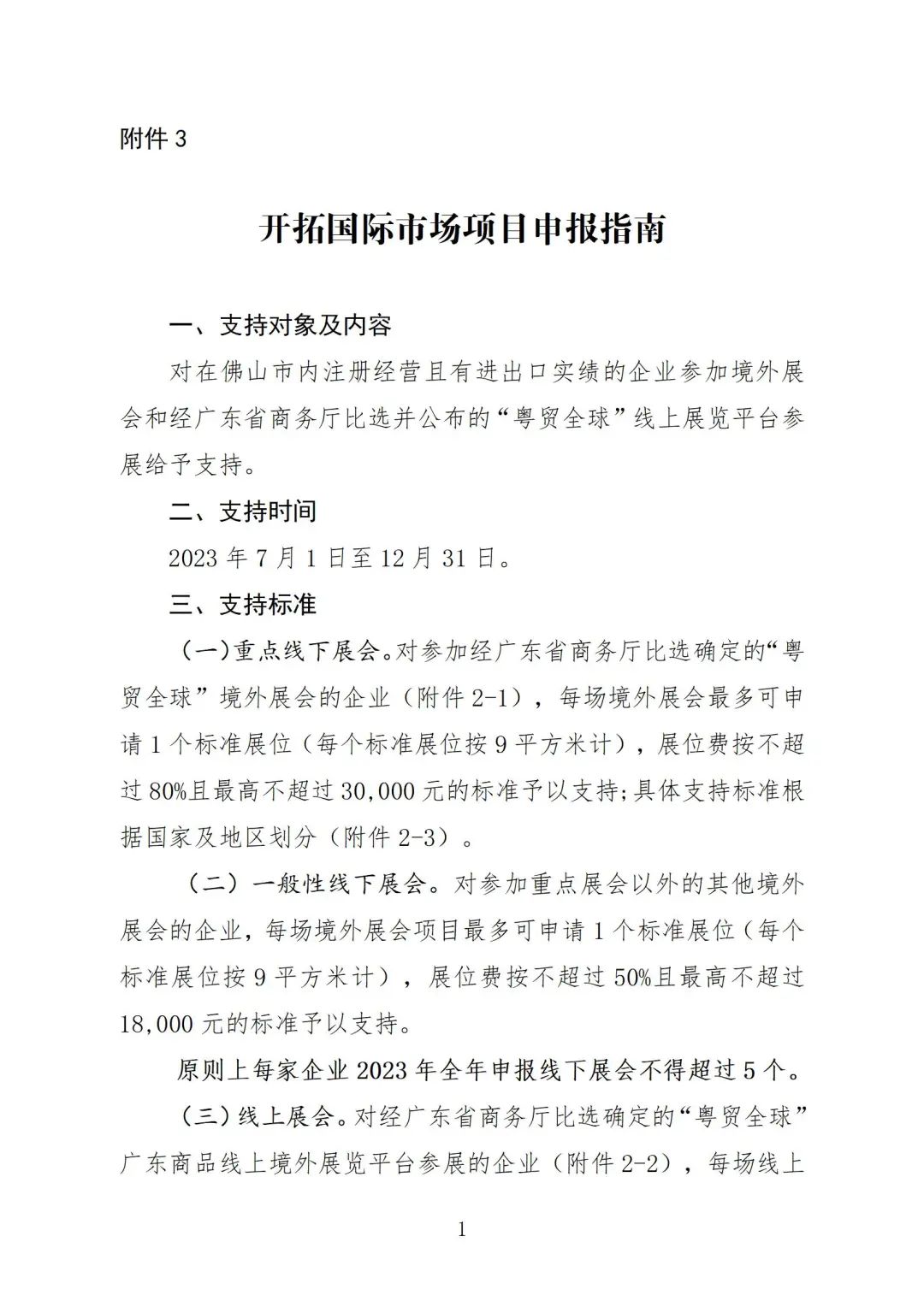 后附文件请大家了解,包括广东省商务厅关于做好2024年“粤贸全球”广东商品境外展览平台相关工作的通知(关联省级补贴)、2024年佛山市重点推荐组织的境外国际性展会项目汇总表(关联市级补贴)、开拓国际市场项目申报指南(补贴政策要求,2023年文件供参考)。
