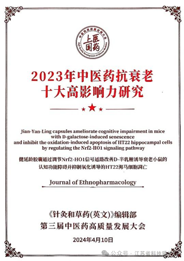 健延龄胶囊是苏州中药龙头企业“中华老字号”雷允上药业公司出品的著名抗衰老OTC中成药,来源于“京城四大名医”施今墨先生遗方,是我国第一个卫药健字Z-01号产品、1999年被列入国家中药二类保护品种、2001年被列入OTC品种甲类,是老龄人群日常保健的重要产品,市场前景广阔,但其作用机制并不清楚,限制了临床应用与市场推广。朱悦教授针对健延龄胶囊组方与临床应用特点,采用衰老整体动物模型与离体细胞模型系统阐释了健延龄胶囊“填精髓,养气血,调脏腑,固本元”功效的科学内涵,特别深入研究了健延龄胶囊改善衰老导致的学习与记忆等认知功能障碍的作用靶点与信号通路,为中医药抗衰老研究提供了新思路,同时也促进了该产品的市场推广与临床应用。该成果以论文形式发表于中科院一区SCI期刊《Journal of Ethnopharmacology》,经《针灸和草药(英文)》杂志编委会评选,入选“2023年中医药抗衰老十大高影响力研究”。