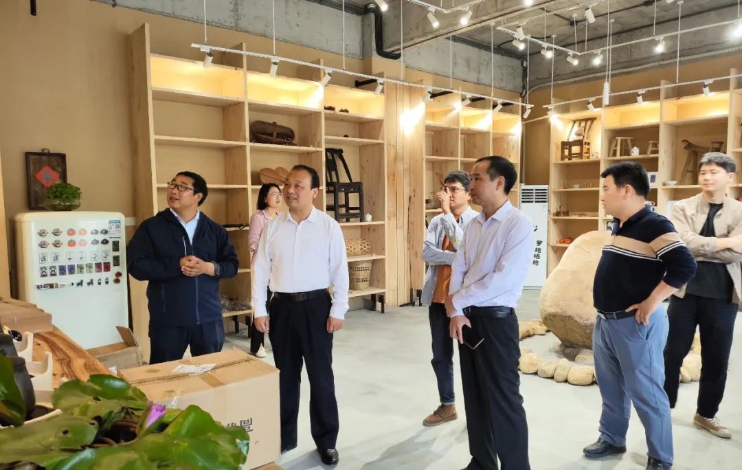 黄冈市副市长潘国林到集团旅游投资公司鸠兹古邑文旅休闲街区调研旅游业态运营工作,旅游投资公司总经理白安会介绍有关情况。