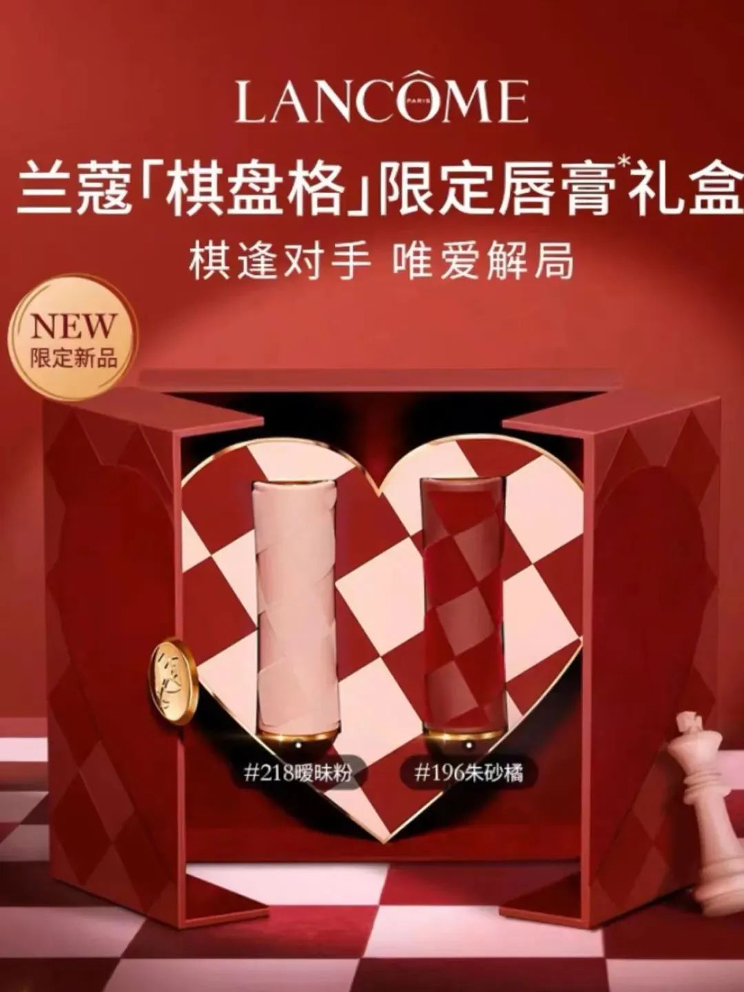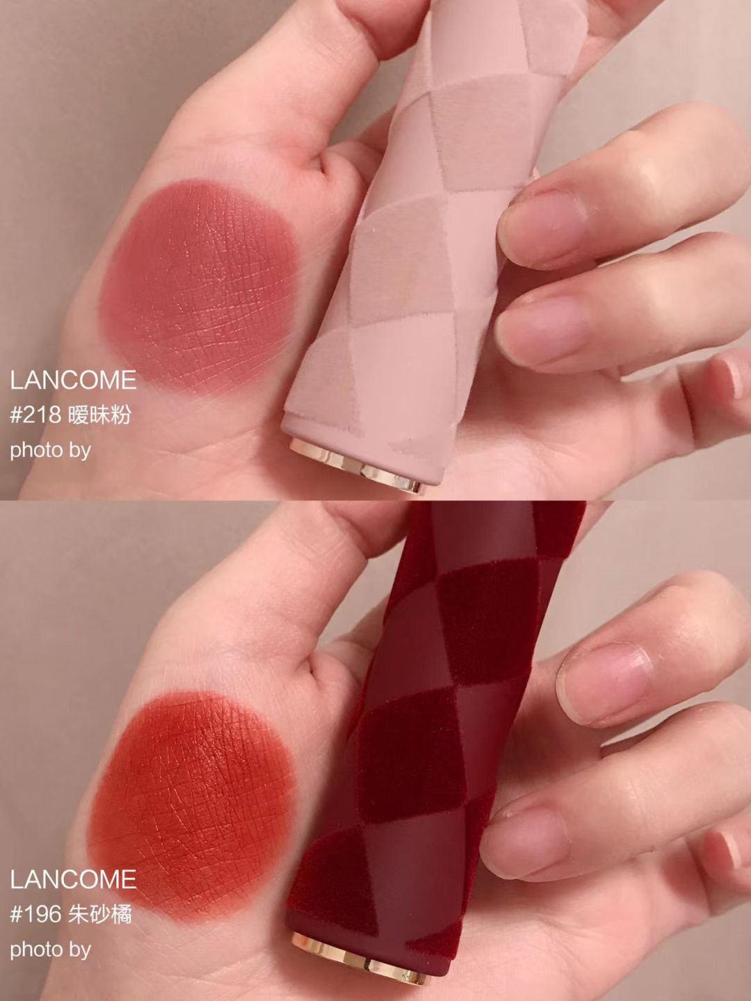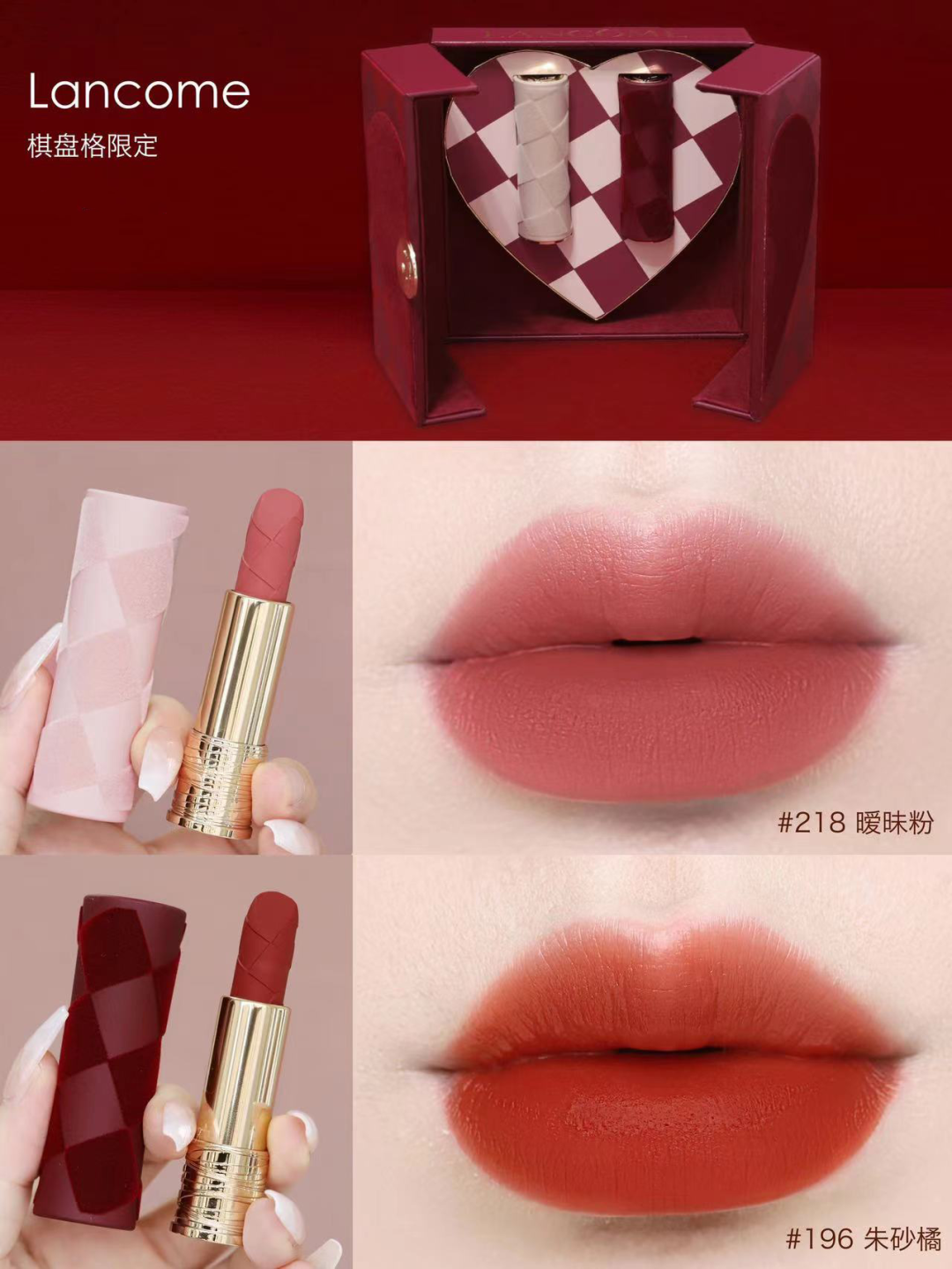 这款礼盒包含了兰蔻当下最火的小蛮腰系列绝美组合:#196朱砂橘与#218暧昧粉。少女心+爱意满满的丝绒口红,搭配爱心形状的礼盒,细节处都是爱你的形状️礼盒和口红外观上都印有高级的兰蔻logo,红粉丝绒+烫金的配色。最热销的当属金晨代言的这支196,是它家火出圈的断货色号。