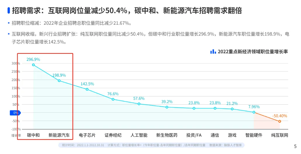 随着可再生能源和环保的关注度越来越高,新能源行业已成为未来就业热点,根据脉脉人才智库统计,2022年新能源车企职位增长幅度高达198.9%!