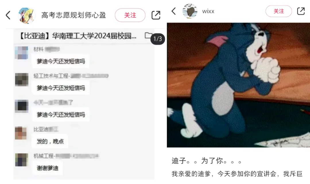 校招群内大学生们着急询问比亚迪还发不发进面短信,“当初喊你‘迪子’是我冒犯,现在只求迪爹捞我上岸”。