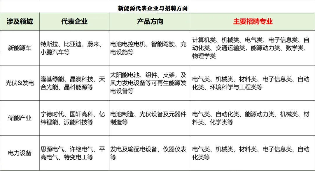 下表小编为大家汇总了新能源行业涉及领域、代表企业、产品方向及主要招聘专业,供高考生参考↓