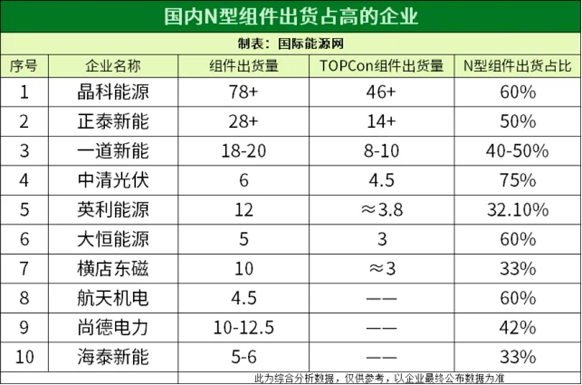一道新能在2018年才刚成立,一直都看好N型组件。今年年初,一道新能还表示计划在年内投资25亿元建设年产14GW的TOPCon电池和20GW组件项目。同时,该公司还背靠三峡能源等央国企,很快就进入了N型组件出货占比前十位置。