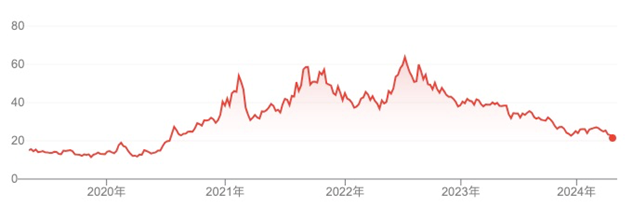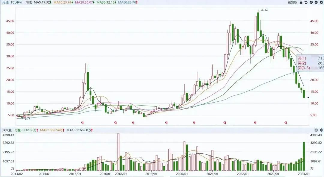 还有光伏硅片龙头企业TCL中环,2018年至2022年该公司股价曾暴涨十倍,股价最高涨至40.1元/股,市值最高曾超过2000亿元。