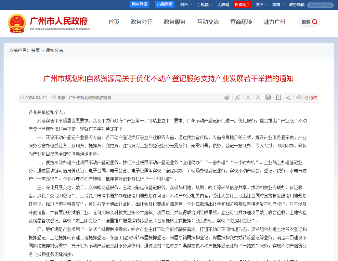 4月22日,《广州市规划和自然资源局关于优化不动产登记服务支持产业发展若干举措的通知》发布。