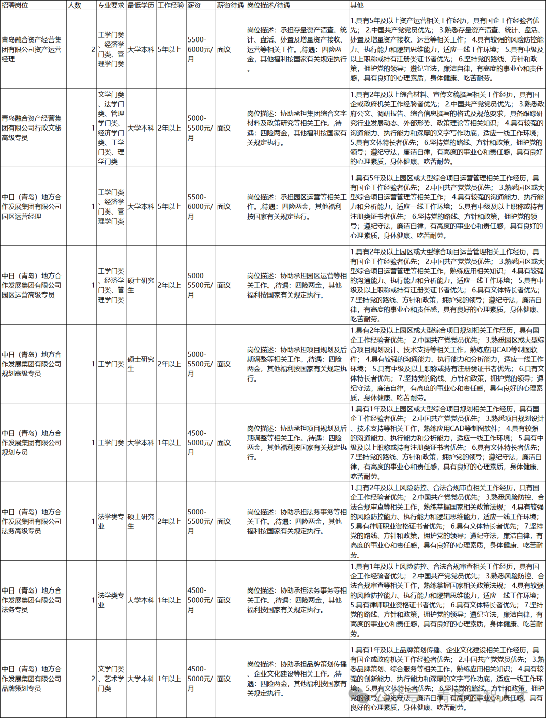 青岛西海岸新区融合控股集团有限公司招聘计划公告
