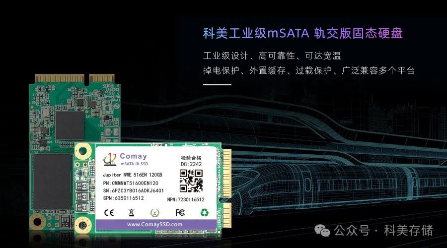 科美工业级mSATA 轨交版固态硬盘遵循严苛的工业级设计标准,以保障高铁在行驶过程中遇到颠簸和震动时,数据存储的可靠性。