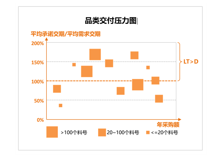 在这个图中,不仅呈现了每个采购品类交付压力的大小,还用可视化的方式呈现了对缩短标准采购提前期LT影响较大的两个因素:采购品类包含的料号多少和采购金额大小。一个采购品类包含的物料号个数越多,要缩短采购提前期LT就越困难;一个采购品类的采购金额越小,供应商为缩短LT做出努力的意愿就会越弱。