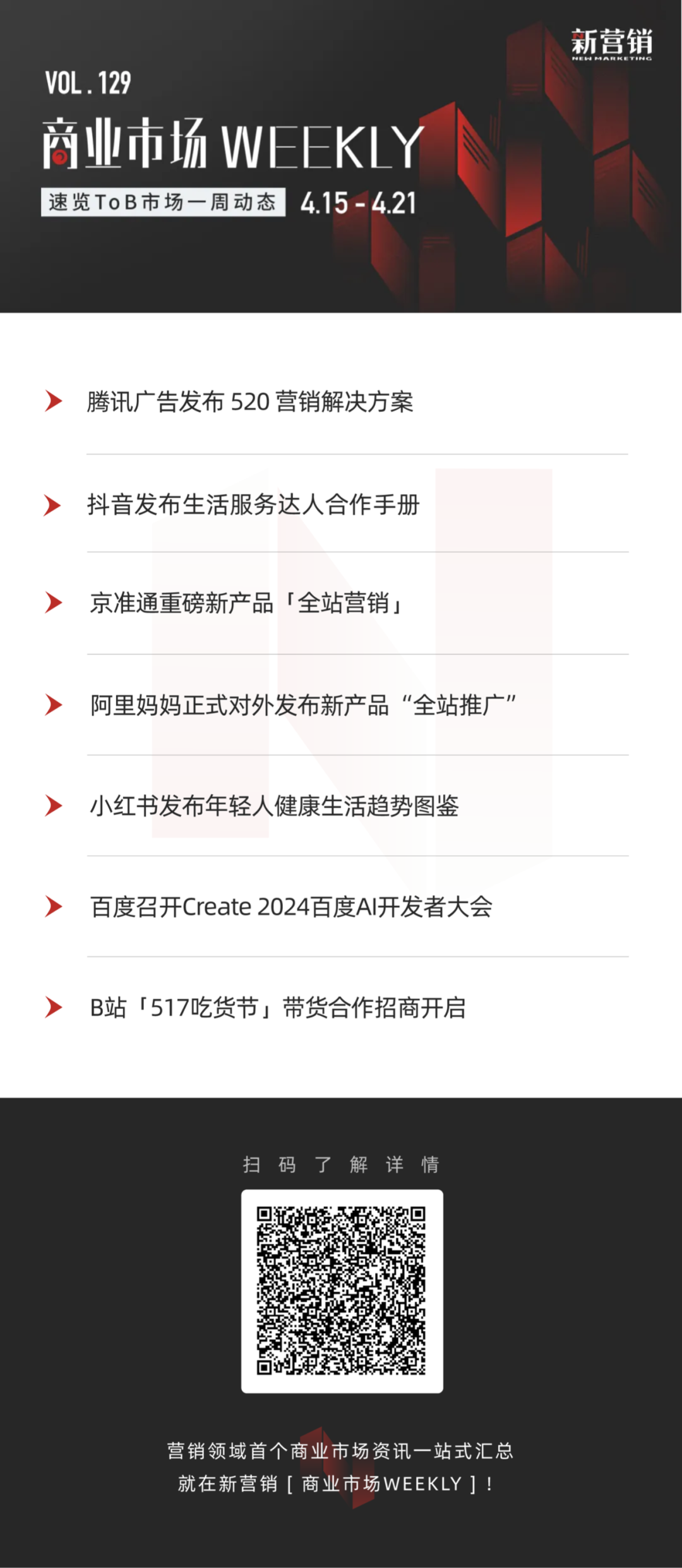 头部营销平台动态、最新营销产品、峰会资讯、招商资源及各类营销干货... 广告主、平台方、服务商亦或是关注营销的你,绝不能错过的商业市场资讯,就在新营销[商业市场WEEKLY] !