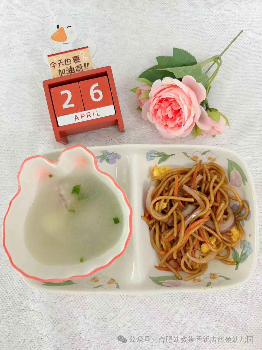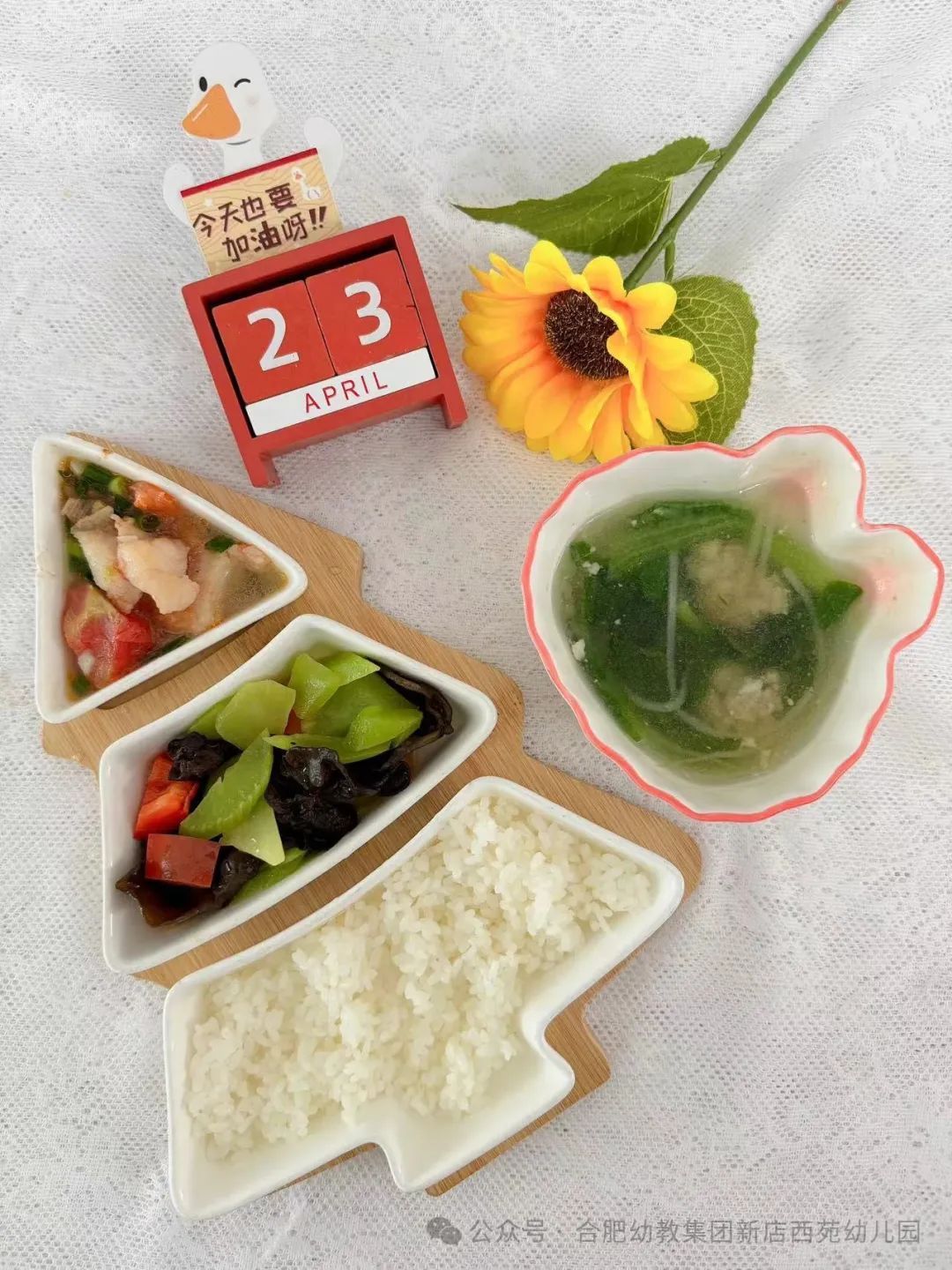 大米饭、茄汁龙利鱼、甜椒木耳炒莴笋、小白菜豆芽肉圆汤