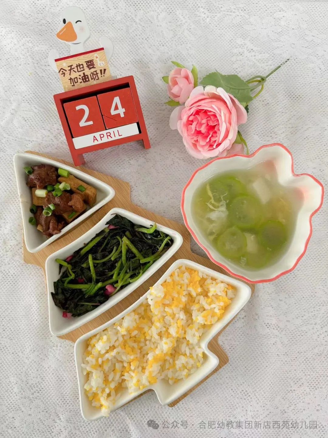 玉米糁米饭、豆干烧鸭块、蒜泥红苋菜、丝瓜豆腐鸡蛋汤