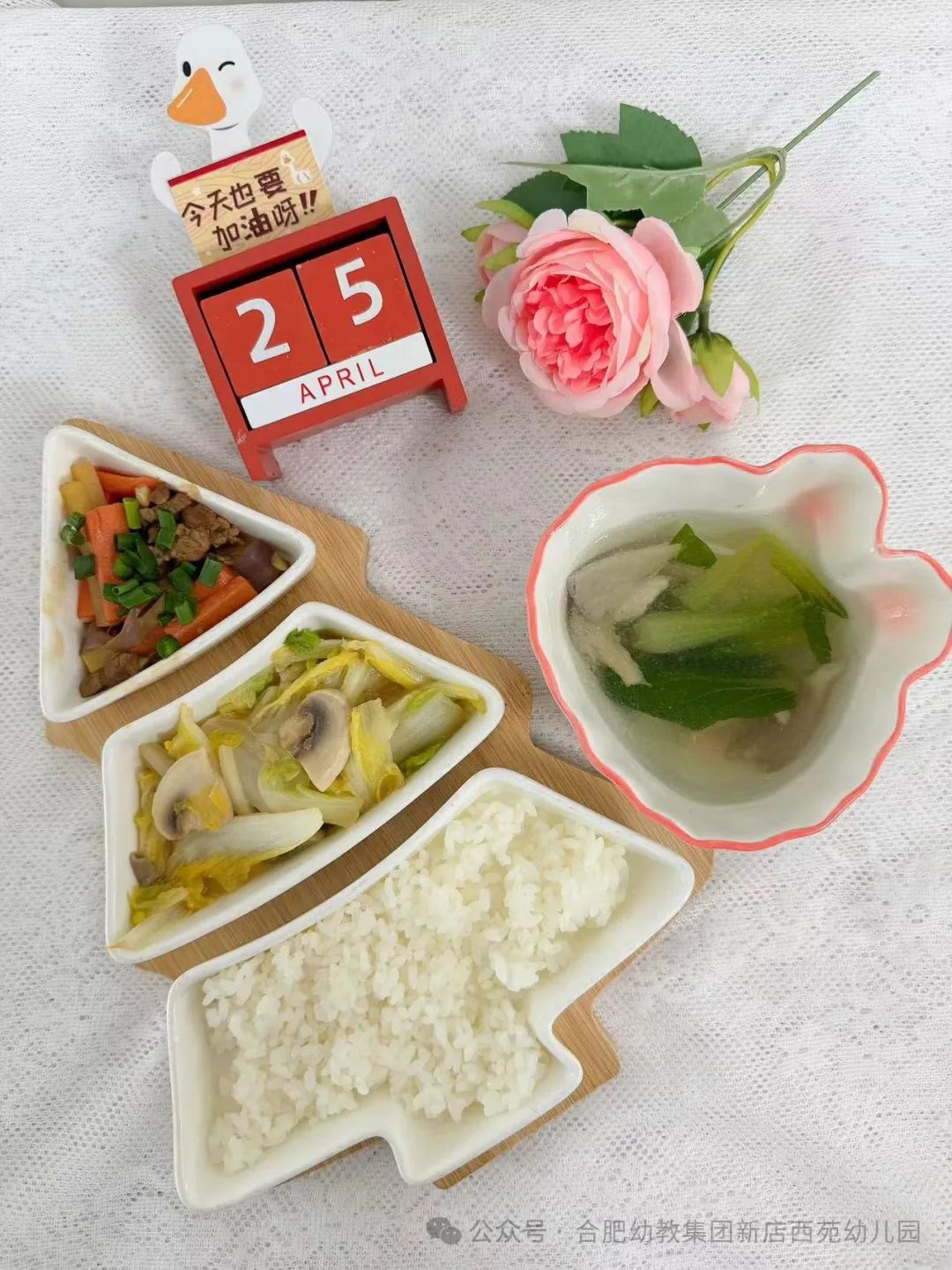 大米饭、三彩牛柳、口蘑炒娃娃菜、平菇青菜肉片汤