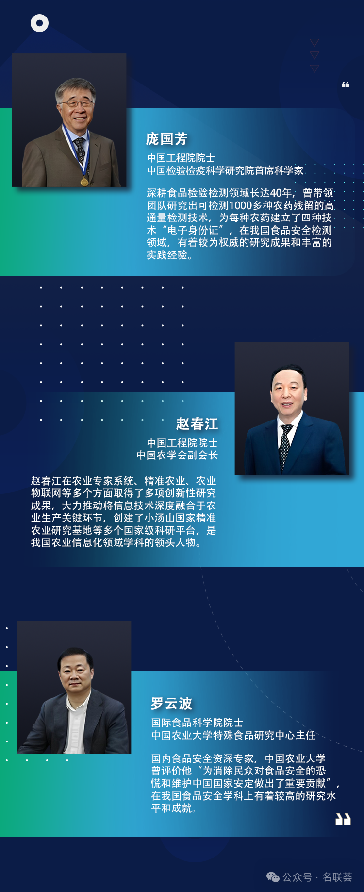 经名联荟邀请,中国工程院院士、食品科学检测技术学科专家庞国芳,中国工程院院士、北京市科协副主席赵春江以及国际食品科学院院士、食品安全专家罗云波出席博览会观摩考察并发表主题演讲。