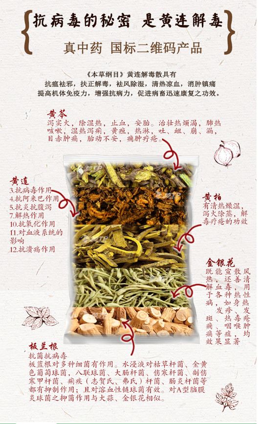 板蓝根、黄连、黄芩、黄柏、黄芪、淫羊藿、多种维生素、解热因子、生物因子、免疫增强剂等。