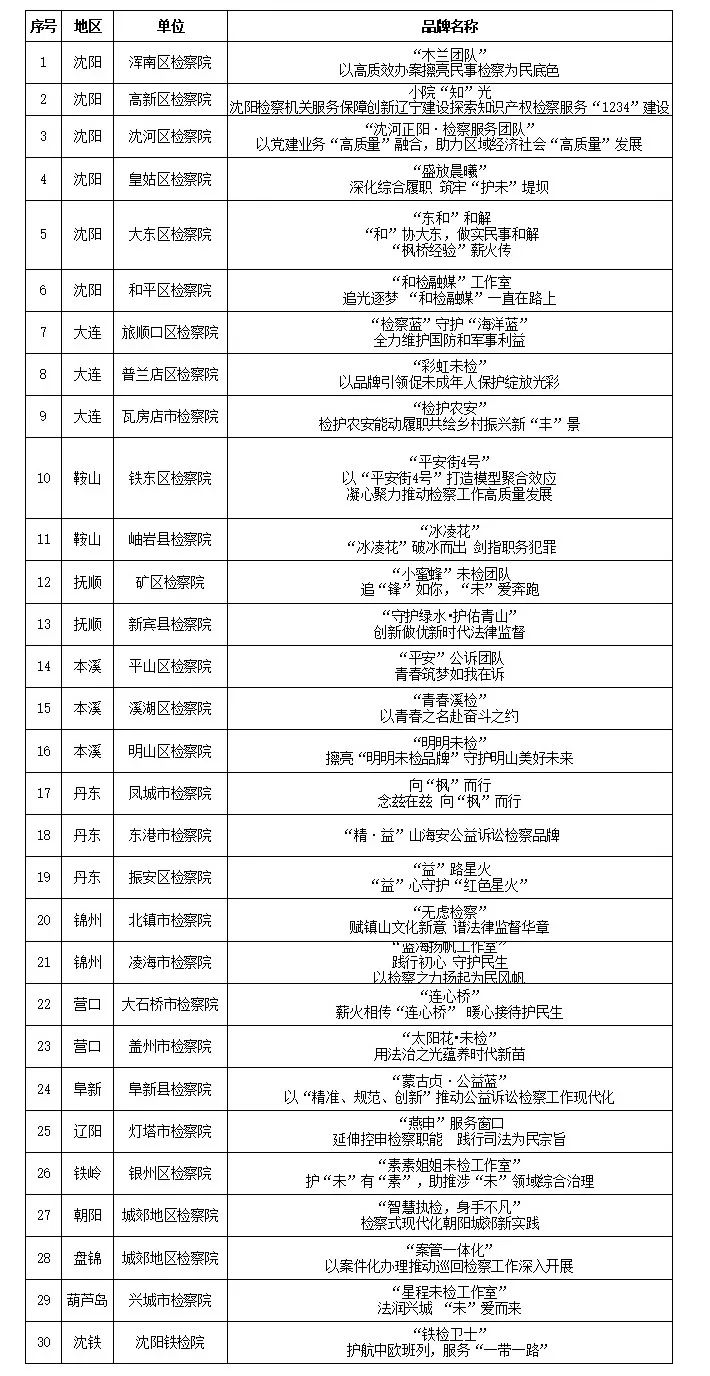 评审会上,9位省人大代表、省政协委员、省人民监督员组成的“外部评审团”和省检察院10位各条线业务专家组成的“内部评审团”齐聚一堂,严格依据“品牌名称、品牌内涵、品牌价值、品牌影响力、品牌发展”等五个方面评选标准,充分发表对60个特色品牌的评审意见,提出推荐建议。经过发表意见、交流看法、独立评审、投票角逐,沈阳浑南区检察院的“木兰团队”等30个优质特色品牌脱颖而出。这30个品牌涵盖党的建设、队伍建设、“四大检察”各个方面,每个品牌均紧扣地区特点、聚焦工作重点、彰显时代亮点,生动诠释了全省检察机关与全体检察人员深学笃用习近平法治思想,与时代发展同向、与人民期盼同频,以政治高度担当政治责任、以监督力度履行法治责任、以民生温度彰显社会责任,为大局服务、为人民司法、为法治担当的检察实践和崭新风貌。参与评选的代表委员纷纷表示,基层检察工作是全部检察工作的基础,检察品牌更是基层检察院建设的“窗口”和“名片”,省检察院组织开展“一院一品”品牌评选活动,体现了省检察院党组深入贯彻落实党中央决策部署和省委要求,紧紧围绕党和国家工作大局,推动“高质效办好每一个案件”“努力让人民群众在每一个司法案件中感受到公平正义”的决心和勇气。通过创新品牌培育和发布,也能够让群众明显地感受到检察履职的触角正在从一个相对专业的封闭空间向社会治理各个领域延伸。希望检察机关能够通过更多、更丰富的形式,宣传展示检察机关为党分忧、为人民尽责、为社会服务的工作成果,为推动辽宁振兴发展贡献更多检察智慧和力量!下一步,此次评选出的30个优质特色品牌将进入网络投票评选环节,省检察院党组将依据投票结果,最终研究确定辽宁检察“一院一品”示范品牌10个、优秀品牌20个。
