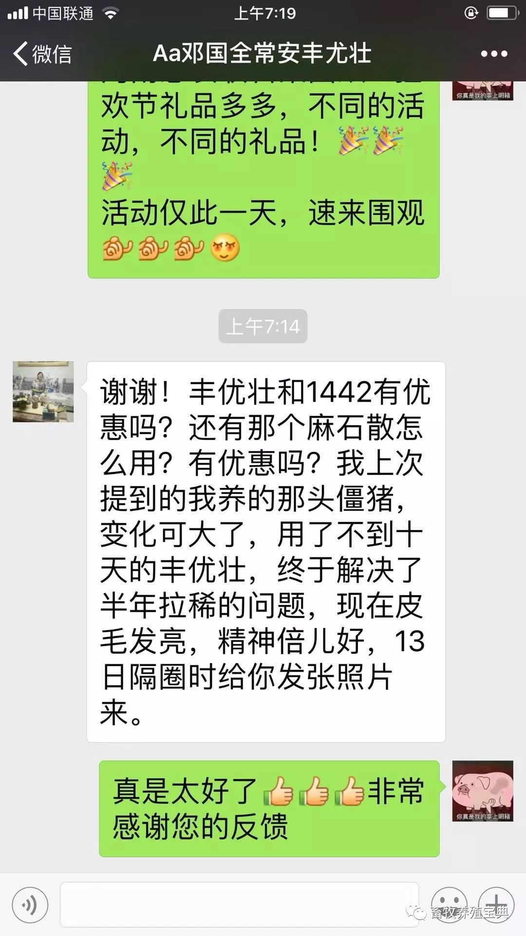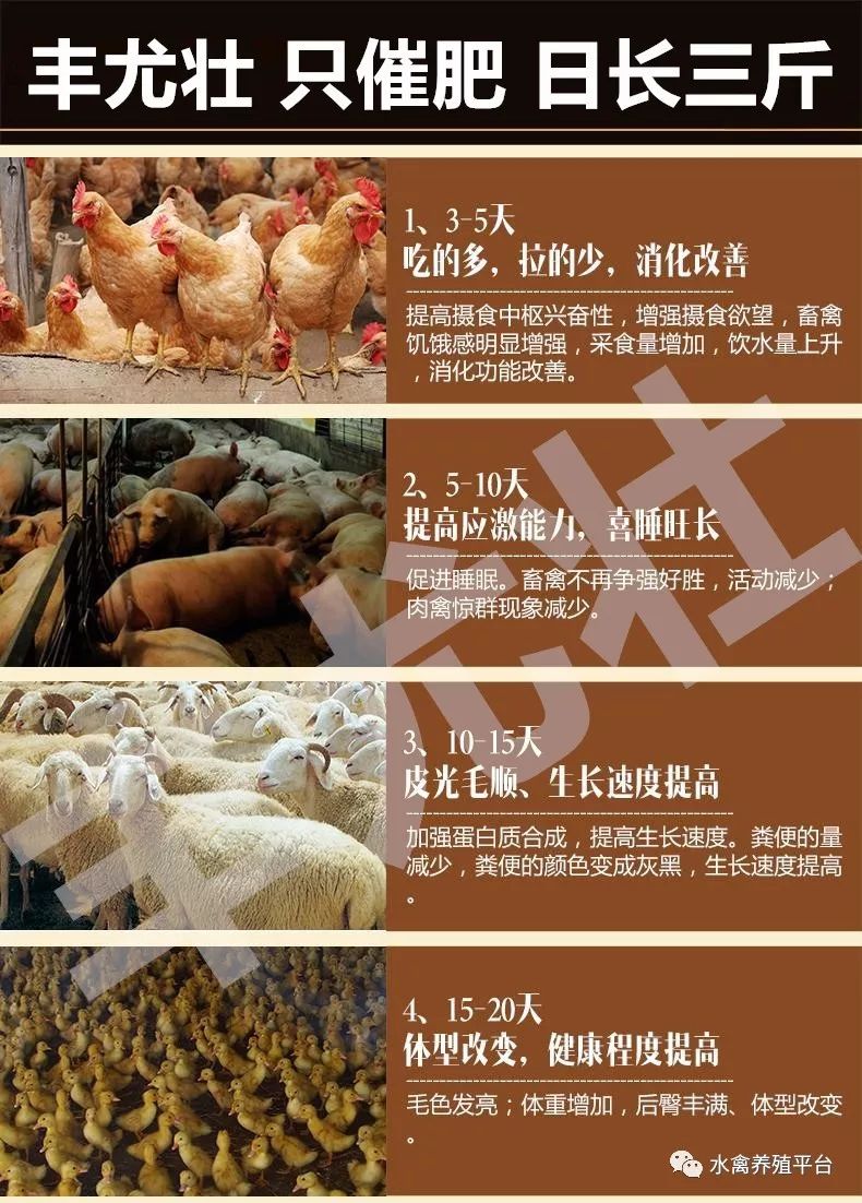 “丰尤壮” 的十大益处 本品具有健胃消食,增食增肥、促生长、抗应激、提高免疫力的功效。身体好就一好百好,养殖就是养肠道,胃肠好就能节约成本效益高!