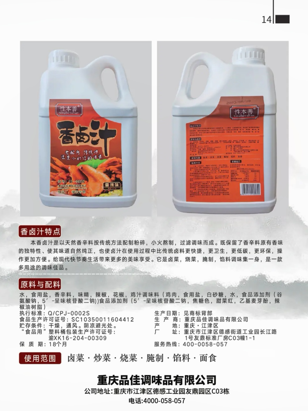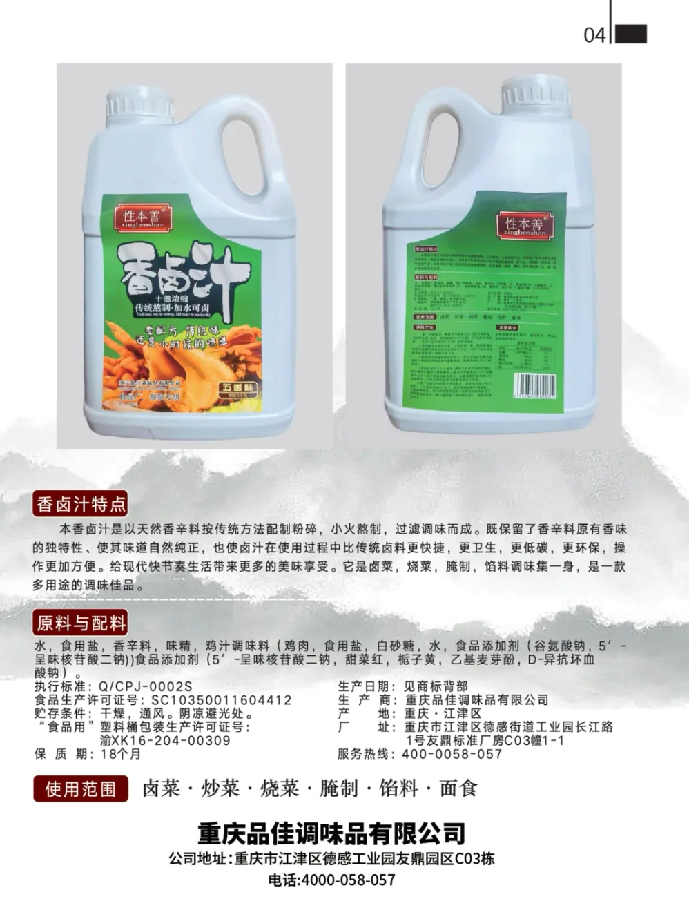 重庆品佳调味品有限公司是一家专业生产卤汁的企业,本产品具有操作简单、方便,味道颜色稳定等特点,使用范围广泛,可浸卤、注射,滚揉等。大型餐饮连锁,食品厂,小型餐饮店均可使用。