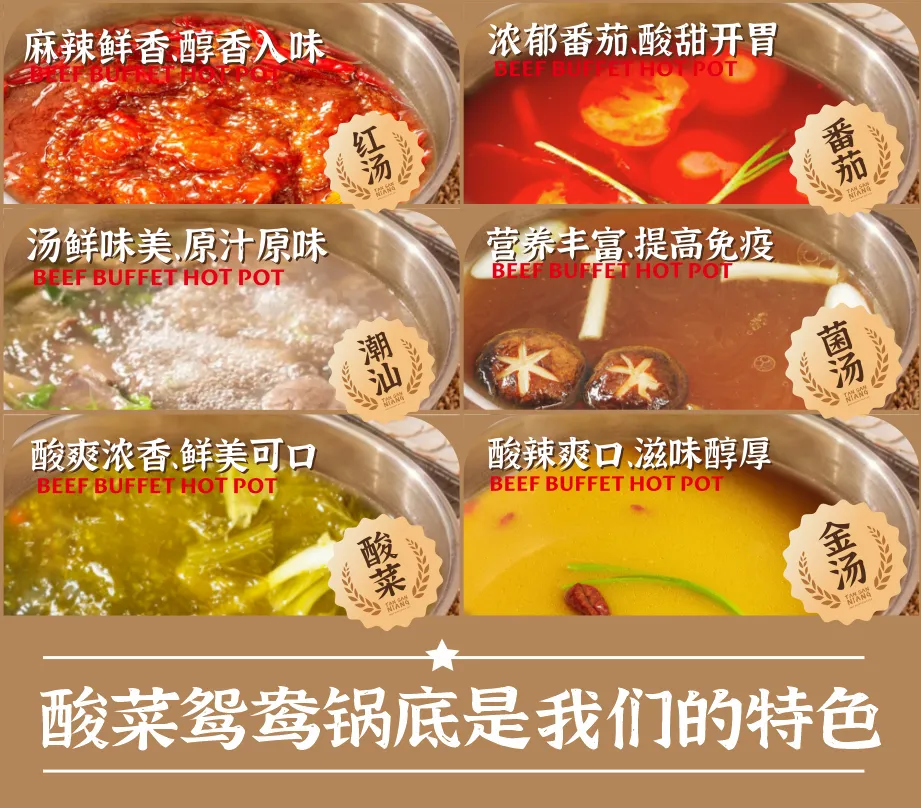 「谭三娘」有潮汕锅、红油锅、酸菜、番茄、菌汤、金汤6种丰富锅底任选任拼,建议是来一份潮汕×红油鸳鸯锅,粤式川式一锅尝尽,两款汤底都能和鲜牛肉碰撞出独特鲜美噢!
