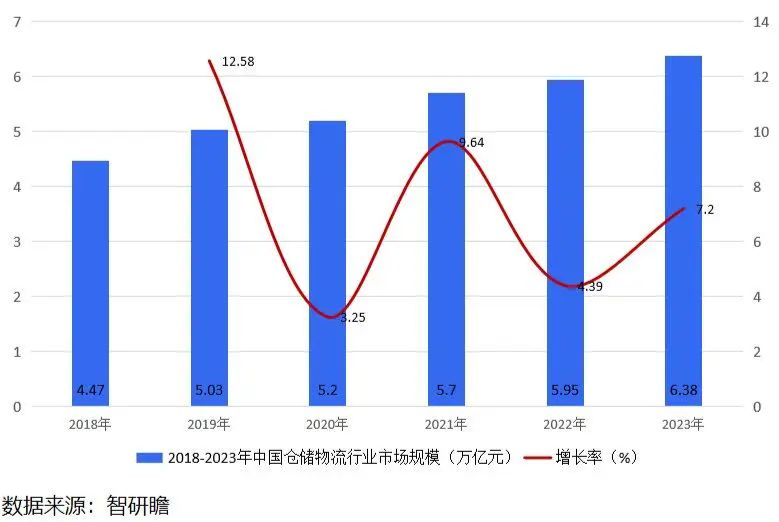 仓储物流行业的供需状况受到经济增长、电子商务的扩张、制造业的需求以及全球化等多重因素的共同作用。在供应方面,我们观察到新建项目及其供应面积有所减少,如2023年6月的数据显示,新项目数量为14个,提供的面积为115.2万平方米,环比和同比分别下降了14.76%和14.65%,这反映出短期内市场供应量的缩减。大多数新增供应集中在经济较发达、物流基础设施较完善的东部地区,占比高达92.26%,而中部地区也记录了一定比例的增长,占4.04%。在需求方面,从全球视角来看,中国的人均仓储面积与发达国家相比仍有差距,例如2021年中国的人均仓储物流设施面积仅为0.7平方米,远低于日本和美国的4平方米和3.8平方米。然而,截至2022年末,中国仓储物流领域的基础设施规模继续增长,体现在通用仓库的总面积已达到大约12.2亿立方米。这一数字相比前一年有所增加,年增长率为1.67%,而在过去一定时期内,其复合年增长率达到了3.96%。与此同时,随着设施规模的扩大和人口数量的相对稳定,人均拥有的仓储物流面积也逐年提高,至2022年已增至0.86平方米/人,显示出中国在仓储物流方面的稳步发展与投资。在市场趋势上,工业物流投资交易的比重有所下降,根据戴德梁行的统计,2023年上半年工业物流在中国房地产大宗交易中的投资比例仅为9%,显著低于2022年的21%。与此同时,国内物流行业的稳健增长推动了仓储市场需求的快速上升,比如从2015年到2019年,中国物流保管费用持续增长,至2019年达到5.0万亿元。这些数据和趋势表明,尽管短期供需可能会经历波动,但长远看,随着经济的进一步发展和电商的兴起,仓储物流行业的需求预计将保持增长势头。中国仓储物流行业目前展现出一种稳健增长的经营态势,随着国内物流市场的坚实发展和电子商务等行业需求的上升,仓储物流市场规模持续扩大,2022年达到了5.95万亿元,同比增长率为4.39%。在基础设施方面,行业对固定资产投资的重视反映在超过9000亿元的总额上,且该投资在2022年的增速达到了25.1%,显示了对未来发展的乐观预期。同时,中国政府对仓储物流行业的支持表现在一系列推动高质量发展的政策上,为行业技术革新和服务升级创造了有利的外部条件。技术进步是行业发展的另一个亮点,行业正从传统的人工仓储向自动化仓储转型,利用AGV、自动货架和自动存取机器人等设备,结合信息技术进行实时管理,从而提升运营效率。在竞争格局方面,华鹏飞、新宁物流、飞力达等上市公司通过差异化服务和技术领先在行业内占据显著位置。最后,与发达国家相比,中国的人均仓储面积还有较大提升空间,这预示着中国仓储物流行业未来拥有巨大的发展潜力。在2022年,中国仓储物流行业展现出了显著的增长势头,整体市场规模达到了令人瞩目的5.95万亿元,这不仅是同比上一年降低5.15%,但仍占据了整个物流行业总费用的近三分之一,具体为33.4%。这样的增长背后,是国内物流市场的稳健发展和电子商务等行业对仓储物流服务需求持续上升的双重推动。进一步深入到细节,我们可以看到,随着市场规模的扩大,仓储物流在整个物流行业中的重要性也在不断提升,体现在其费用占比的稳定增长上。此外,就硬件设施而言,截至2022年底,中国的通用仓库总面积约为12.2亿立方米,这个数字不仅揭示了仓储设施规模的持续扩张,而且反映出了过去十年中5.7%的健康复合增长率。然而,尽管行业整体呈现出积极的发展趋势,但中国仓储物流行业的市场集中度相对较低,TOP5上市公司的市场集中度仅为1.51%,这一点揭示了在这个行业中存在着激烈的竞争和分散的市场份额。这种分散的竞争局面可能带来了一定的挑战,比如仓库空置率的波动问题和市场竞争的日益加剧。面对这些挑战,中国仓储物流行业在服务质量和技术应用方面不断提升,智能仓储的发展逐渐成为行业发展的新动力。随着市场需求的不断扩大和技术创新的深入推进,预计未来几年,中国仓储物流行业将继续保持其增长态势,并展现出更大的活力和发展潜力。据智研瞻统计显示,2018年中国仓储物流行业市场规模4.47万亿元,2023年中国仓储物流行业市场规模6.38万亿元,同比增长7.2%。2018-2023年中国仓储物流行业市场规模如下:图表:2018-2023年中国仓储物流行业市场规模