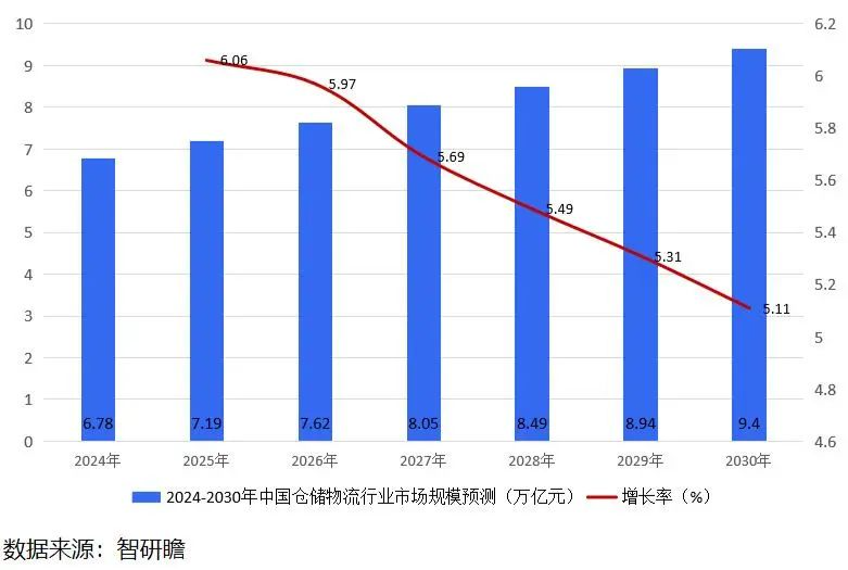 仓储物流行业的发展前景看起来十分乐观,这主要得益于全球化和数字化趋势的推动以及技术的不断进步。随着全球贸易的日益繁荣,跨境电商的兴起为仓储物流行业提供了更广阔的舞台。同时,环保意识的提升也在推动物流业朝着绿色可持续发展的方向迈进,电动车辆、自动驾驶技术、智能仓储系统等绿色技术的广泛应用,将助力仓储物流行业减少碳排放,实现低碳物流。此外,区块链技术的崛起为仓储物流行业带来了更加安全、透明和高效的交易方式,有助于解决货物丢失、偷漏等问题,提升货物追溯和管理的效率。同时,共享经济的蓬勃发展也为仓储物流行业带来了新的机遇,共享物流模式的兴起将降低企业成本,提高资源利用率,实现共赢。另外,物联网技术的快速发展为仓储物流行业提供了智能化升级的可能性,通过实现信息的实时共享和智能决策,能够大幅提升仓储物流的效率和准确性,降低运营成本。然而,仓储物流行业也面临着人才短缺、技术更新换代压力以及环保法规制约等挑战,因此,仓储物流企业需要加大人才培养和技能提升的投入,加强与科研机构的合作,积极推动技术创新和应用,以适应行业的发展需求,实现可持续发展。据智研瞻预测,2024-2030年中国仓储物流行业市场规模增长率在5.1%-6.3%,2030年中国仓储物流行业市场规模9.4万亿元,同比增长5.11%。2024-2030年中国仓储物流行业市场规模预测如下:图表:2024-2030年中国仓储物流行业市场规模预测