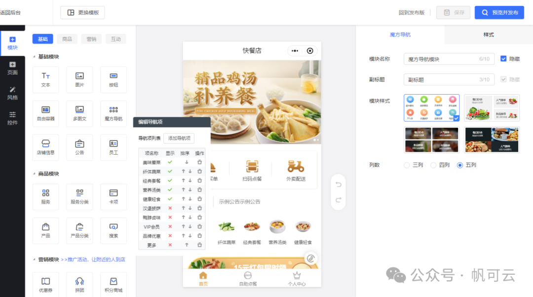 通过电脑可视化的方式,使用鼠标装修设计小程序的页面,并添加配置所需的功能模块,如扫码点餐、菜单展示、自提或外卖选项、在线支付等。