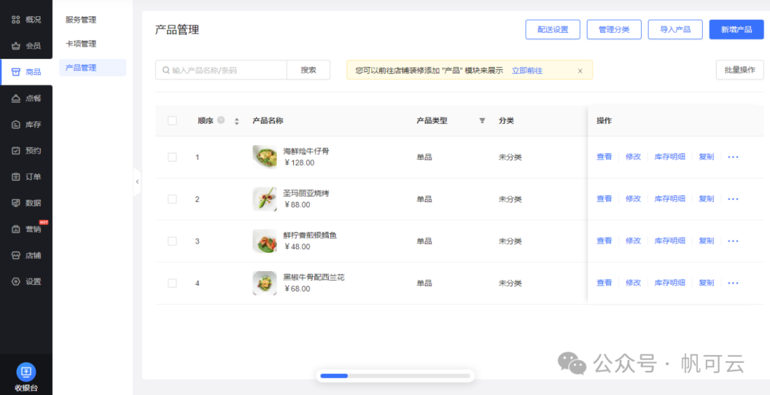 将餐厅的菜单信息在后台同步至小程序,包括菜品图片、价格、描述等。