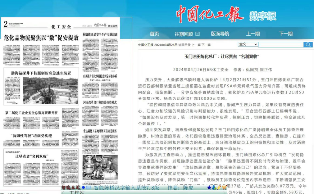 压力突升,大量解吸气瞬时进入转化炉!4月2日21时51分,玉门油田炼化总厂联合运行四部制氢装置当班主操杨燕在监盘时发现PSA单元解吸气压力异常升高,班组成员协同配合、措施果断,一分钟应急处置精准得当,转化炉及PSA单元各运行参数于21时53分恢复正常。杨燕为此获得厂部10000元奖励。