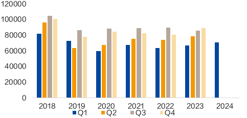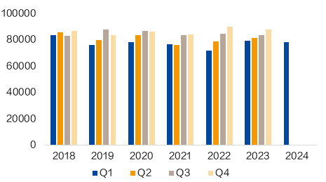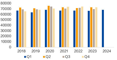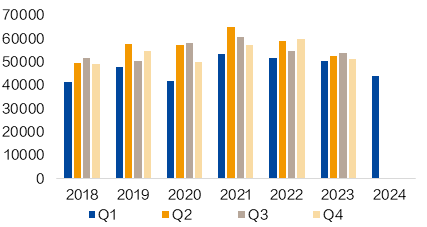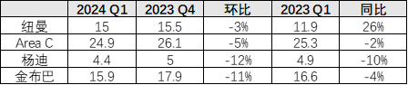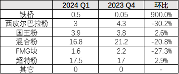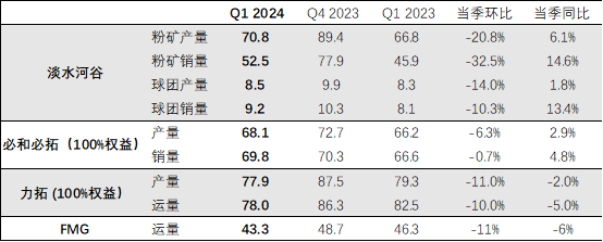 FMG 2024年一季度铁矿石的运量为4330万吨,同比下降6%,环比下降11%,产量为4660万吨,同比下降8%,环比下降15%。FMG维持2024财年发运目标不变(1.92-1.97亿吨),但表示最终发运量将靠近下沿。