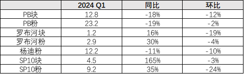 整体来看,力拓一季度产销表现较弱,考虑到其维持24年发运目标不变,而这个目标中位数相比去年高了300万吨,但目前一季度发运相比去年同期下滑450万吨,差距较大。我们预计二季度在天气好转后,力拓发运增速有望明显回暖。