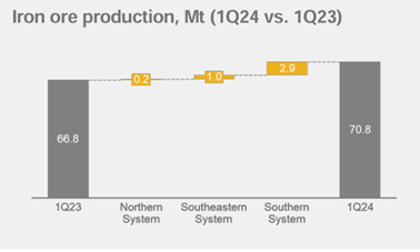 一季度东南部系统的产量同比增加了100万吨,这主要是得益于Brucutu和 Timbopeba的表现较好,以及更高的第三方采购量。不过Alegria的产量有所下滑,主要是由于为了提高产品质量而进行了相关的设施调整。