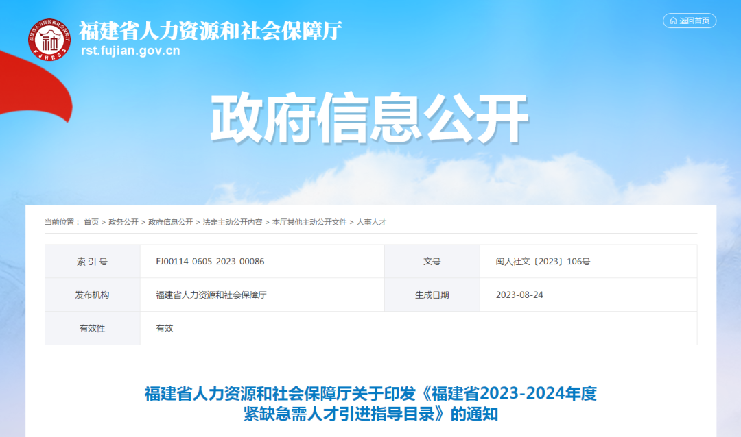 福建省人力资源和社会保障厅印发《福建省2023-2024年度紧缺急需人才引进指导目录》