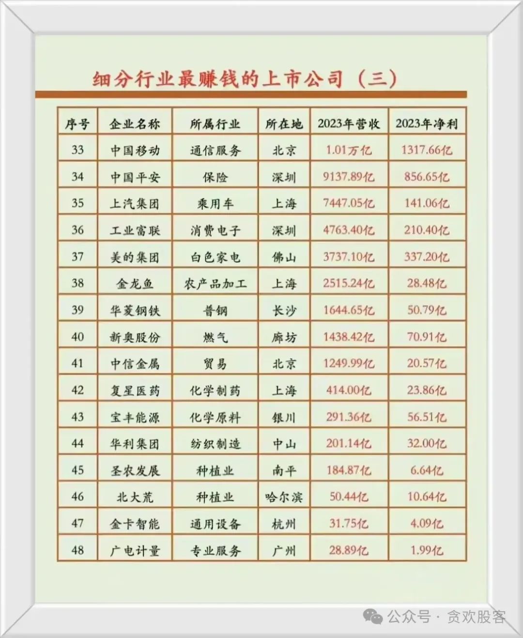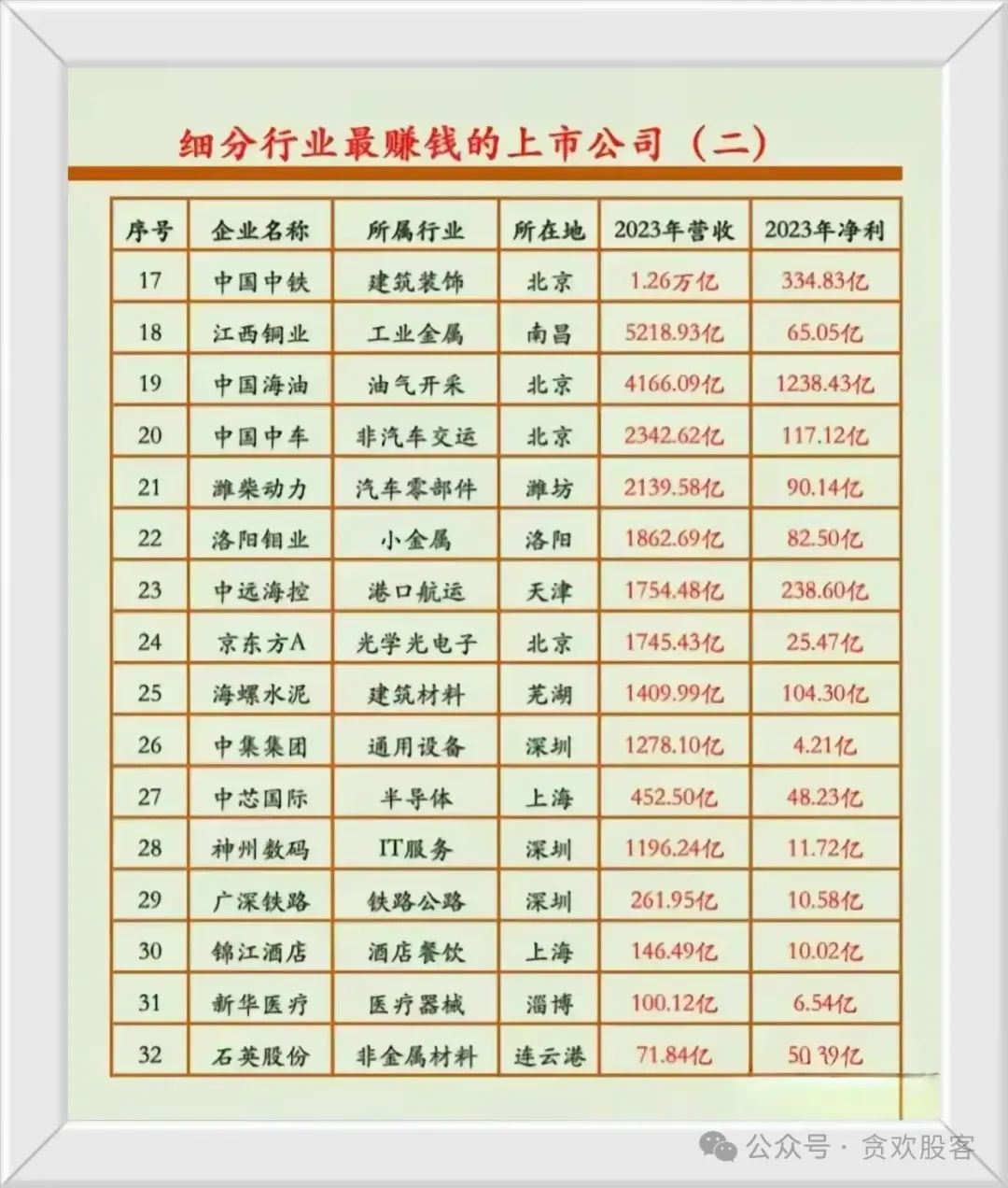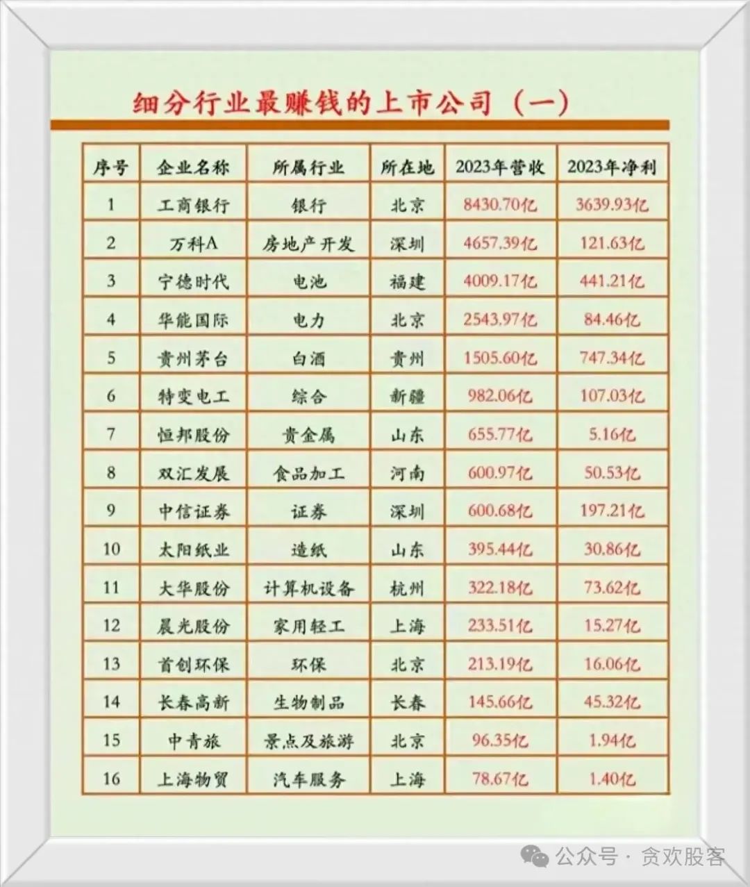 所以现在钱确实难赚了,我们A股其实也是一样的,通过这次财报我们就可以看出,有很多企业一年到头还是赔钱的,甚至有很多是连续几年赔钱,当然也有很赚钱的企业,比如工商银行,今天我就给大家整理了一下A股细分行业里面最赚钱的上市公司,看看到底什么行业比较容易赚钱,相关概念股我已经整理好了,放到了文章的下方,看完觉得有帮助的,可以点赞收藏起来,看看能不能有所启发,也可以关注,转发给有需要的朋友。