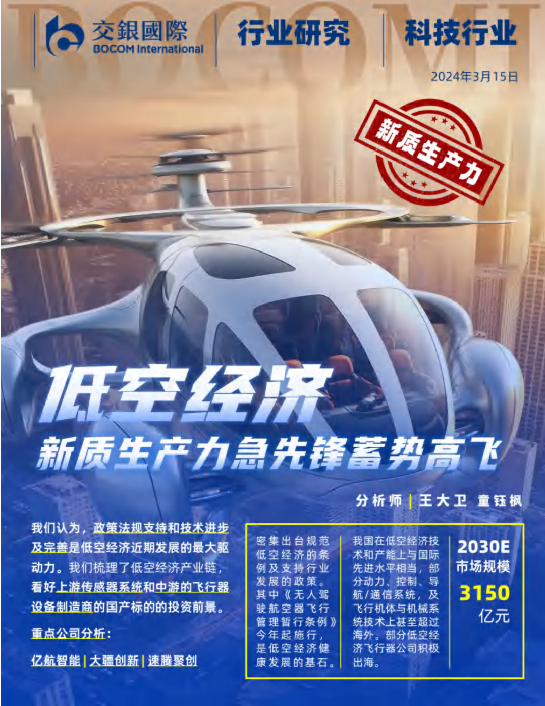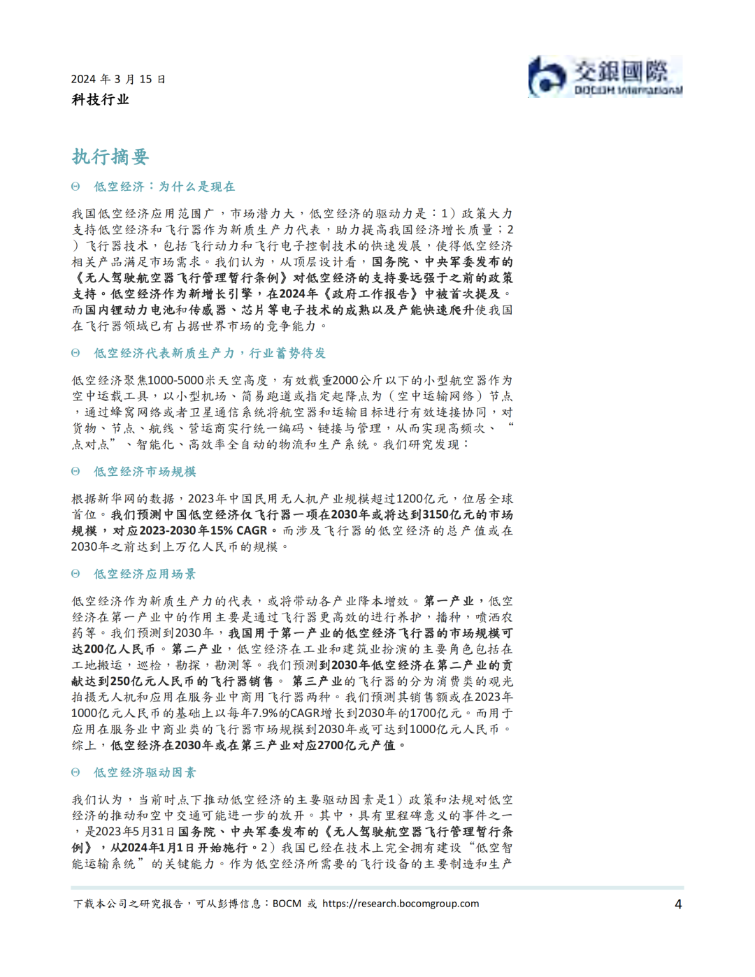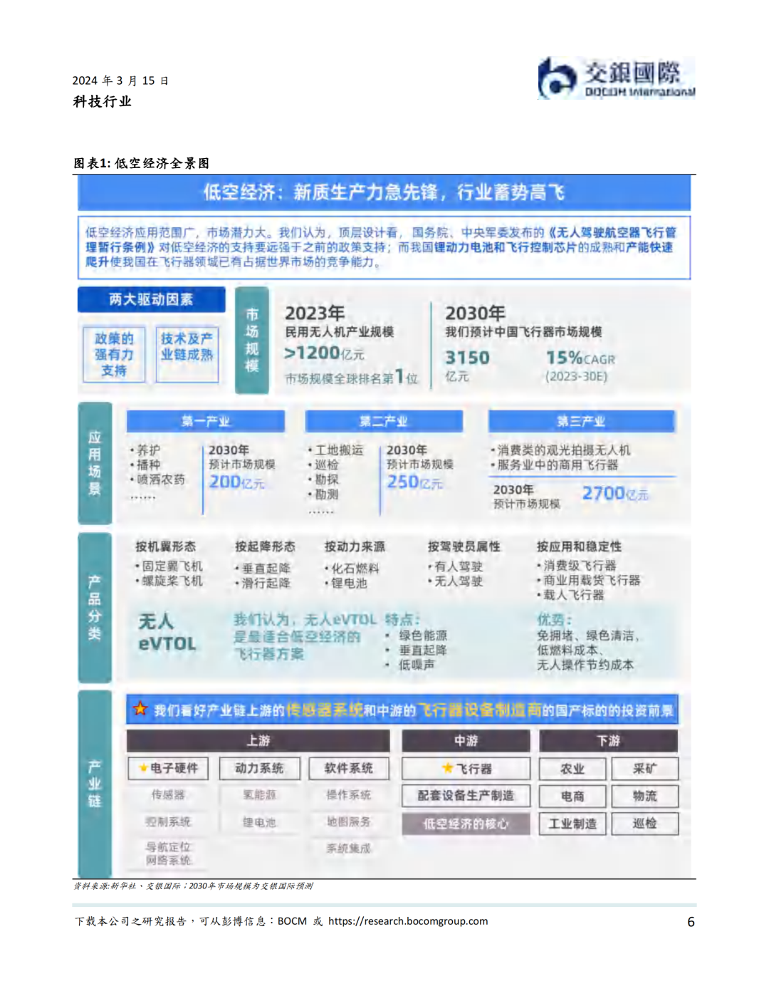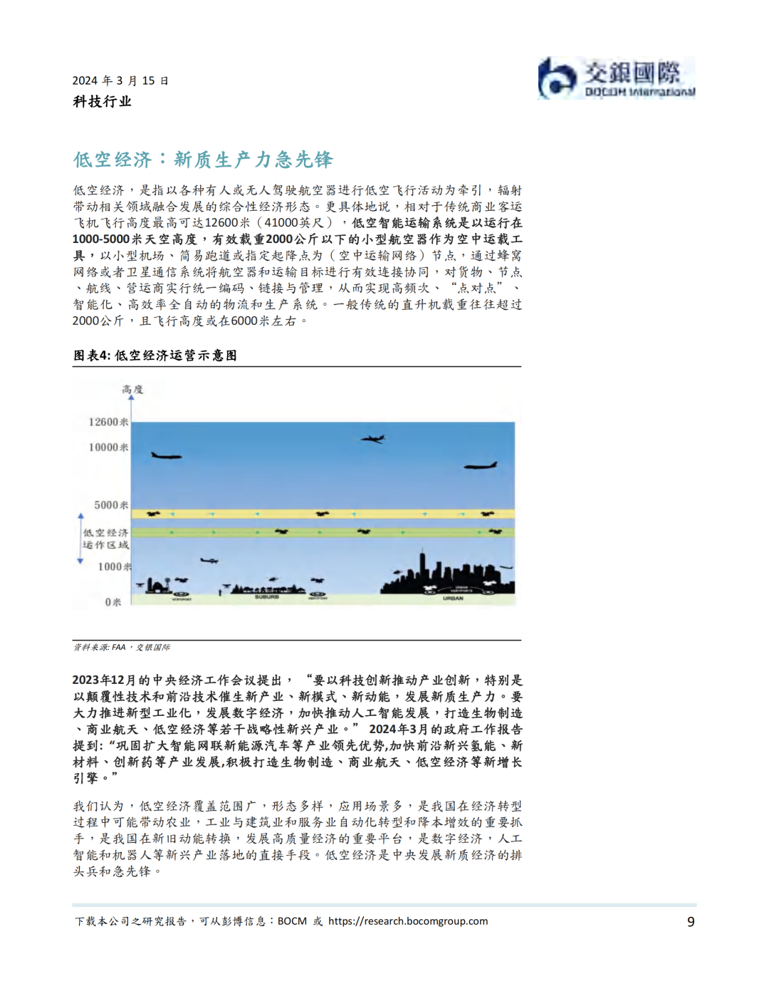 2023年12月,中央经济工作会议指出以科技创新推动产业创新,发展新质生产力,并明确低空经济为具有战略性的新兴产业。2024年3月,低空经济作为新增长引擎,在国务院《政府工作报告》中被首次提及。在低空经济是运行在1000-5000 米天空高度,以有效载重2000公斤以下的小型航空器作为空中运载工具的高效率全自动的物流生产系统。我们认为,虽然还处在行业早期,低空经济覆盖范围广,形态多样,应用场景多,是我国在经济转型过程中可能带动农业,工业与建筑业和服务业自动化转型和降本增效的重要抓手,是新质生产力的急先锋。