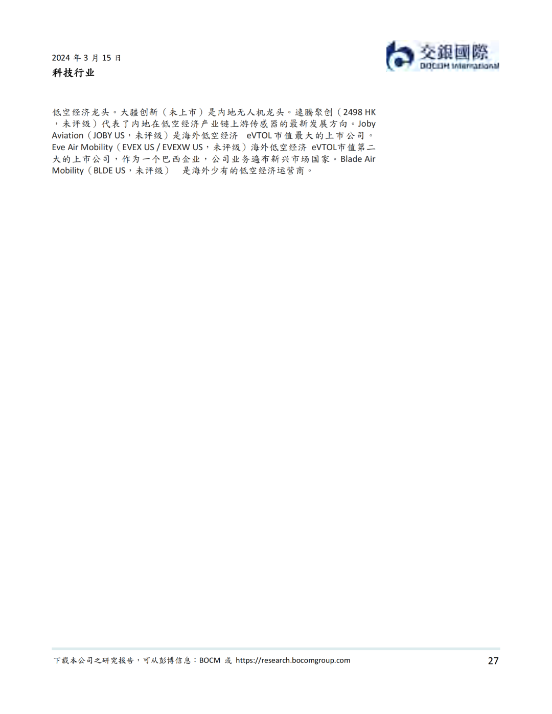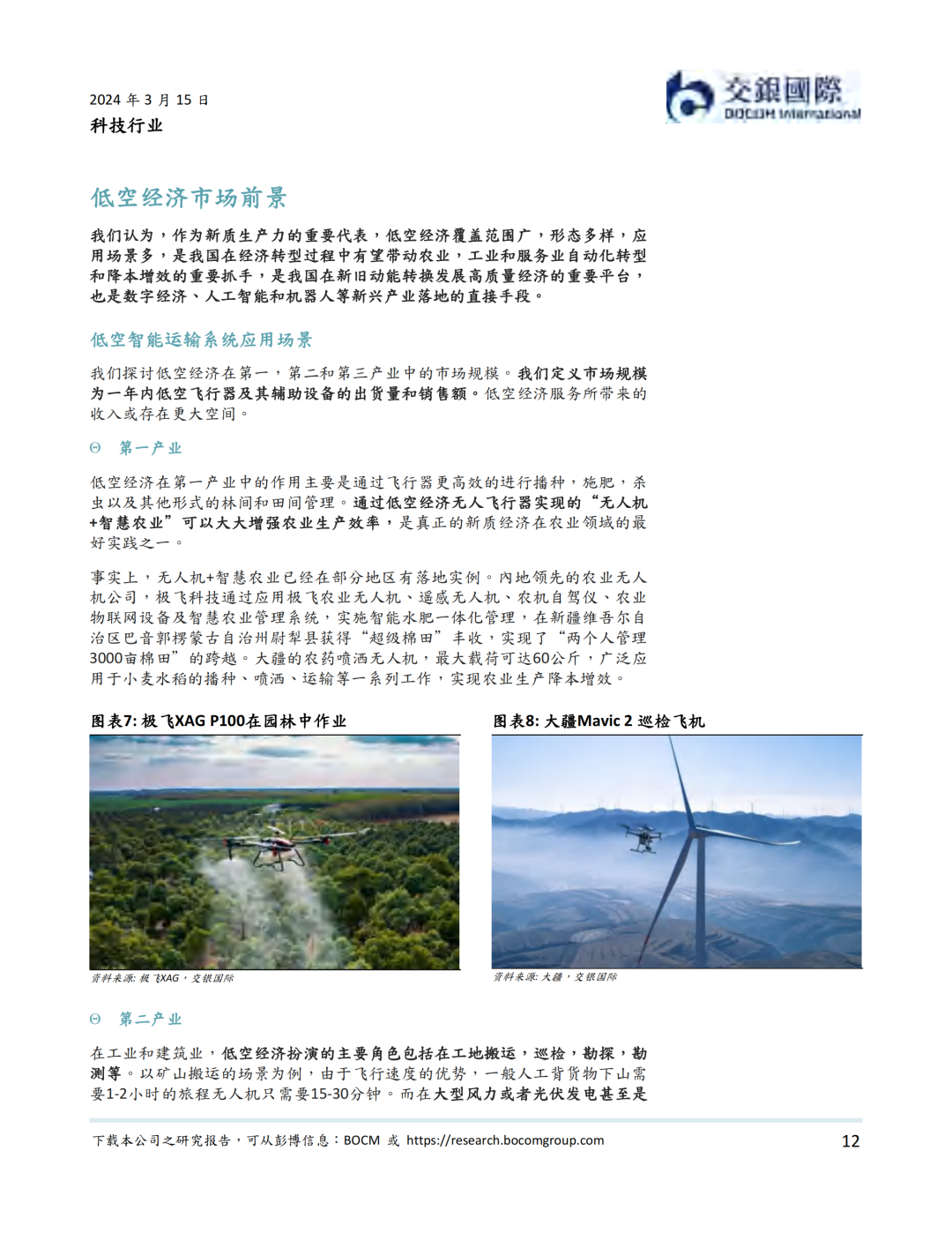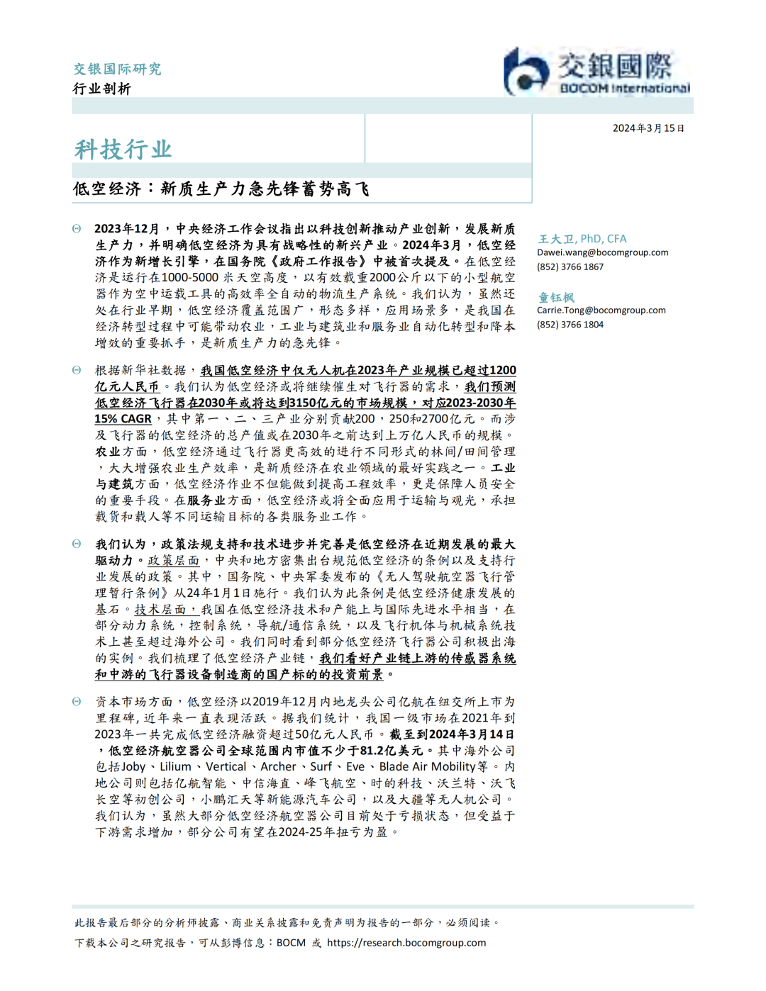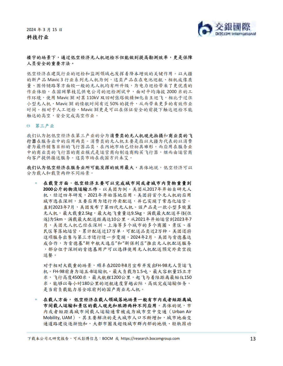 2023年12月,中央经济工作会议指出以科技创新推动产业创新,发展新质生产力,并明确低空经济为具有战略性的新兴产业。2024年3月,低空经济作为新增长引擎,在国务院《政府工作报告》中被首次提及。在低空经济是运行在1000-5000 米天空高度,以有效载重2000公斤以下的小型航空器作为空中运载工具的高效率全自动的物流生产系统。我们认为,虽然还处在行业早期,低空经济覆盖范围广,形态多样,应用场景多,是我国在经济转型过程中可能带动农业,工业与建筑业和服务业自动化转型和降本增效的重要抓手,是新质生产力的急先锋。