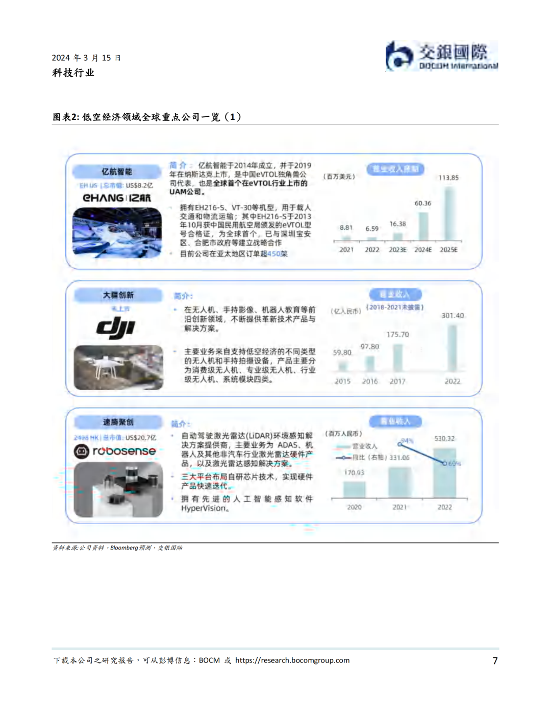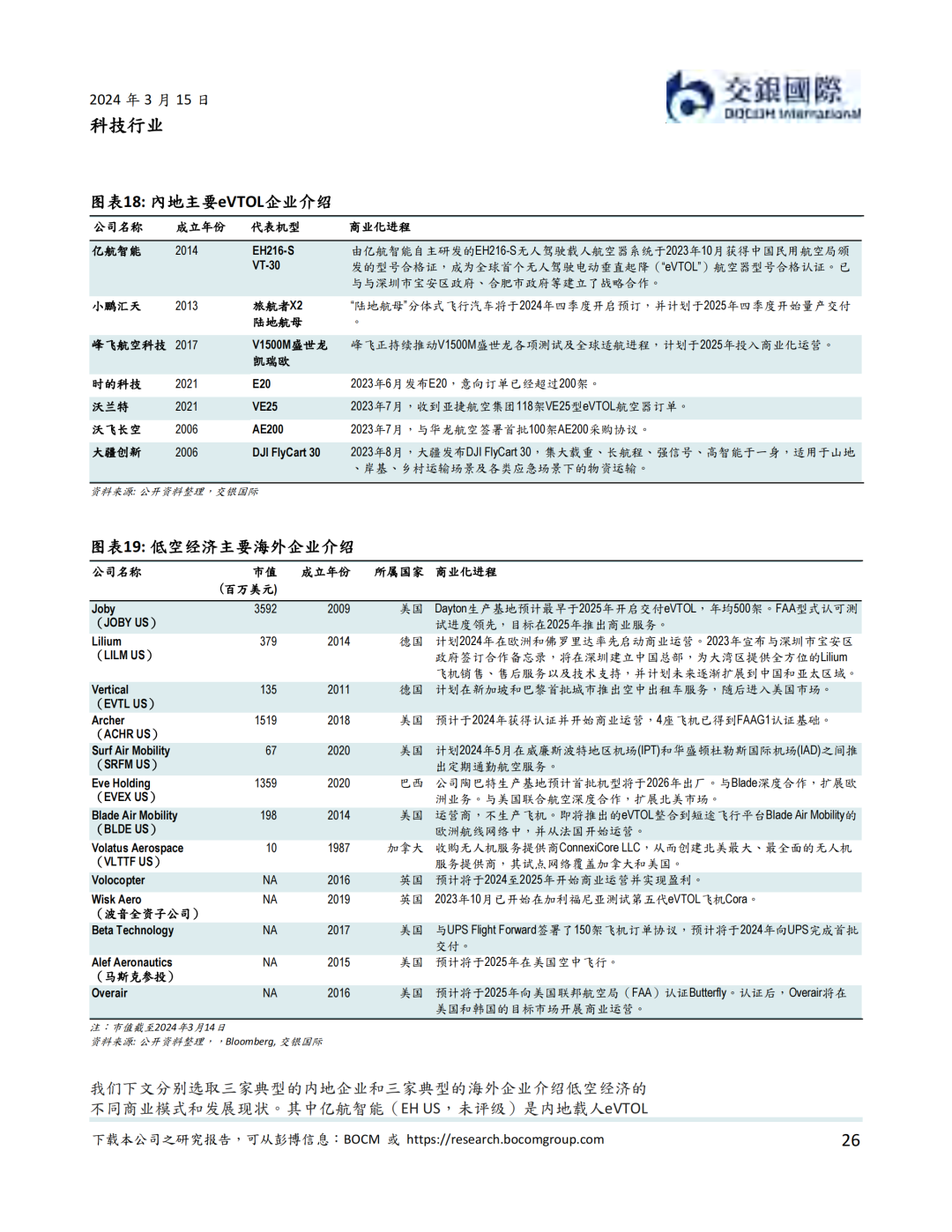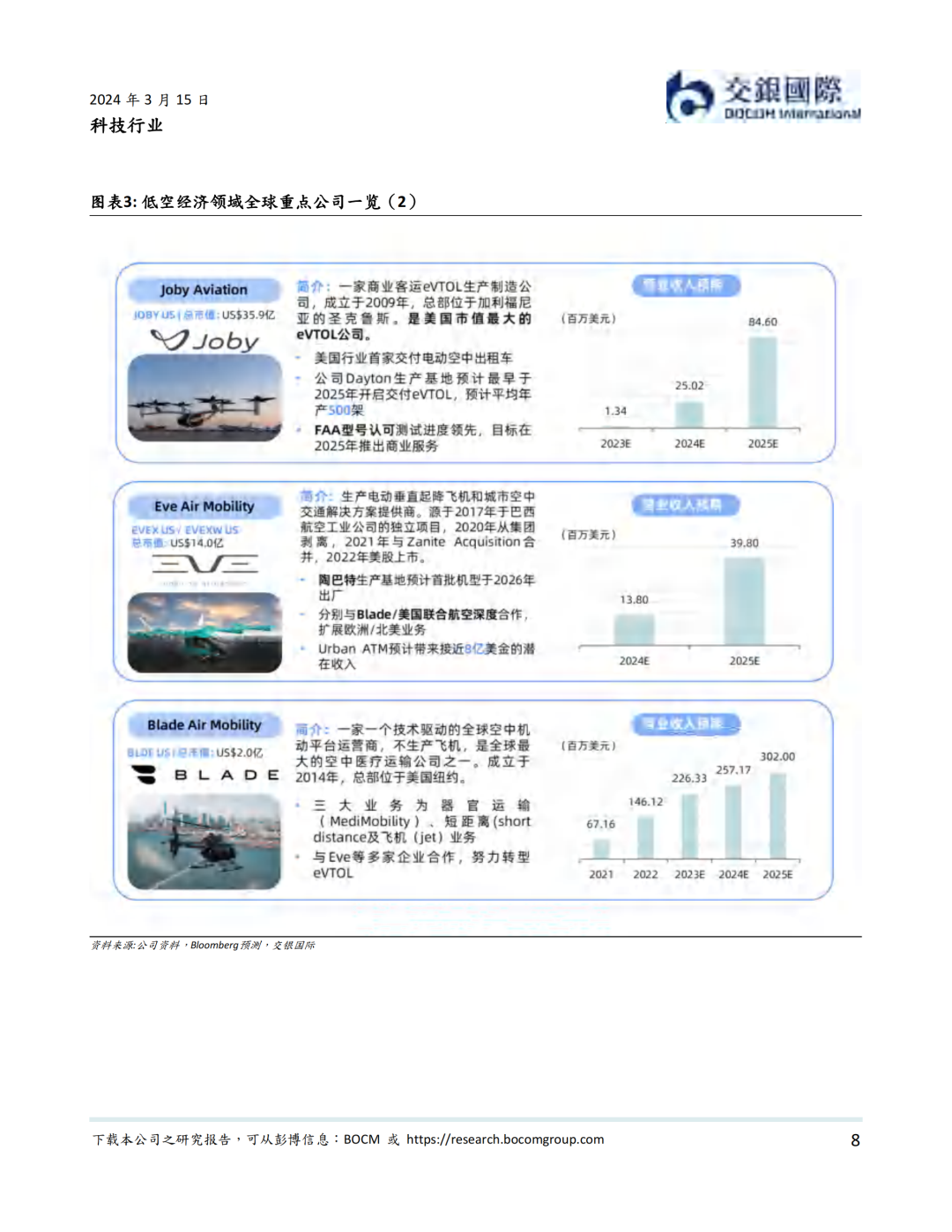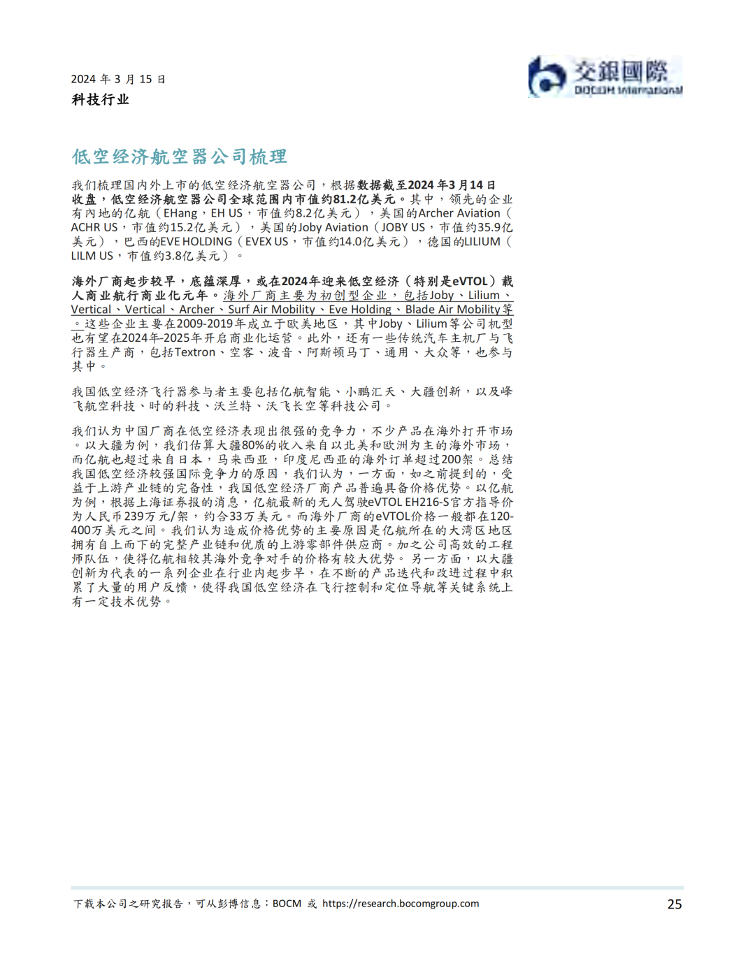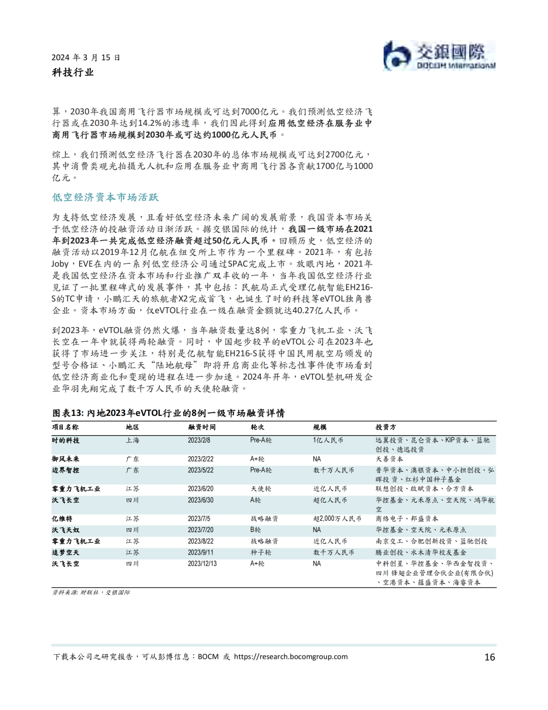 资本市场方面,低空经济以2019年12月内地龙头公司亿航在纽交所上市为里程碑, 近年来一直表现活跃。据我们统计,我国一级市场在2021年到2023年一共完成低空经济融资超过50亿元人民币。截至到2024年3月14日,低空经济航空器公司全球范围内市值不少于81.2亿美元。其中海外公司包括Joby、Lilium、Vertical、Archer、Surf、Eve、Blade Air Mobility等。内地公司则包括亿航智能、中信海直、峰飞航空、时的科技、沃兰特、沃飞长空等初创公司,小鹏汇天等新能源汽车公司,以及大疆等无人机公司。我们认为,虽然大部分低空经济航空器公司目前处于亏损状态,但受益于下游需求增加,部分公司有望在2024-25年扭亏为盈。
