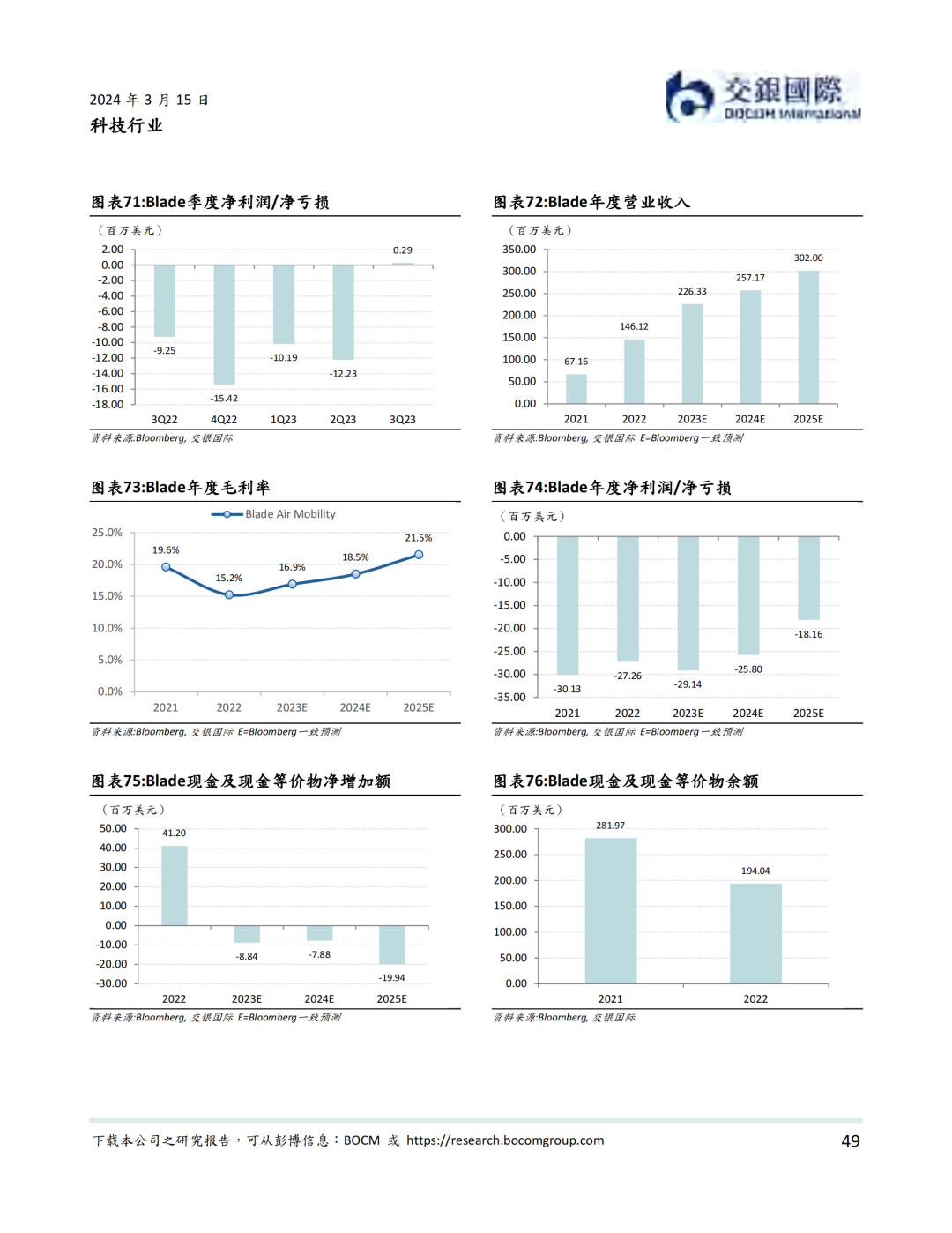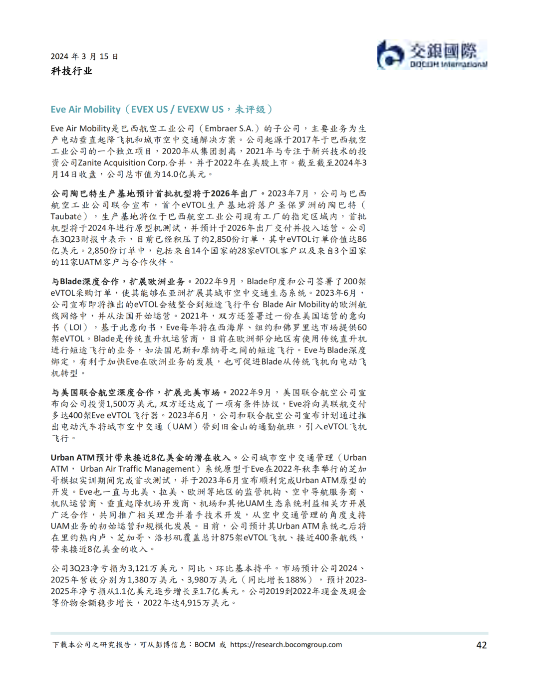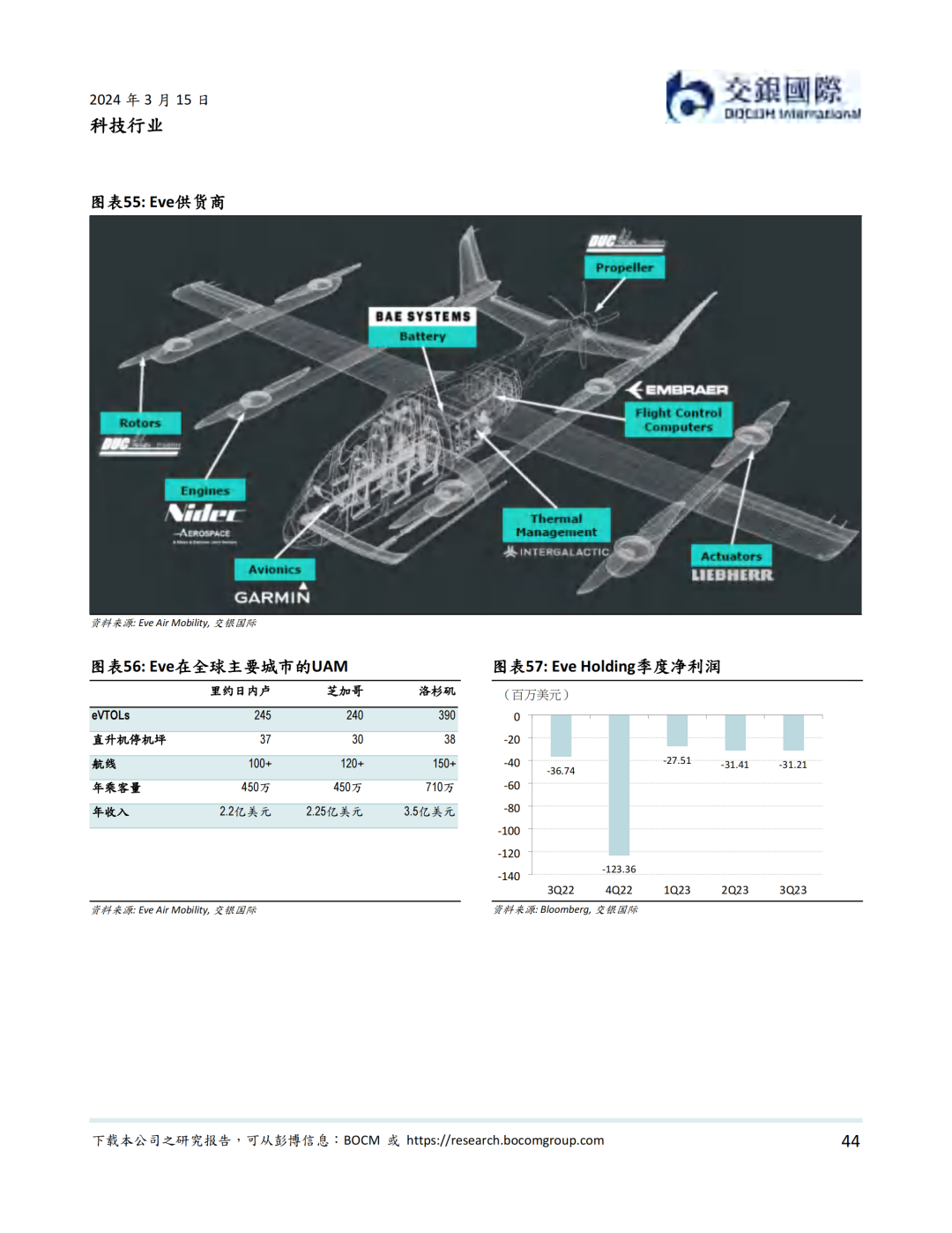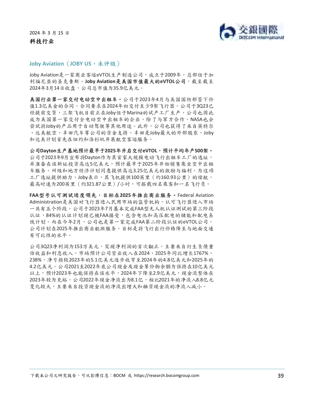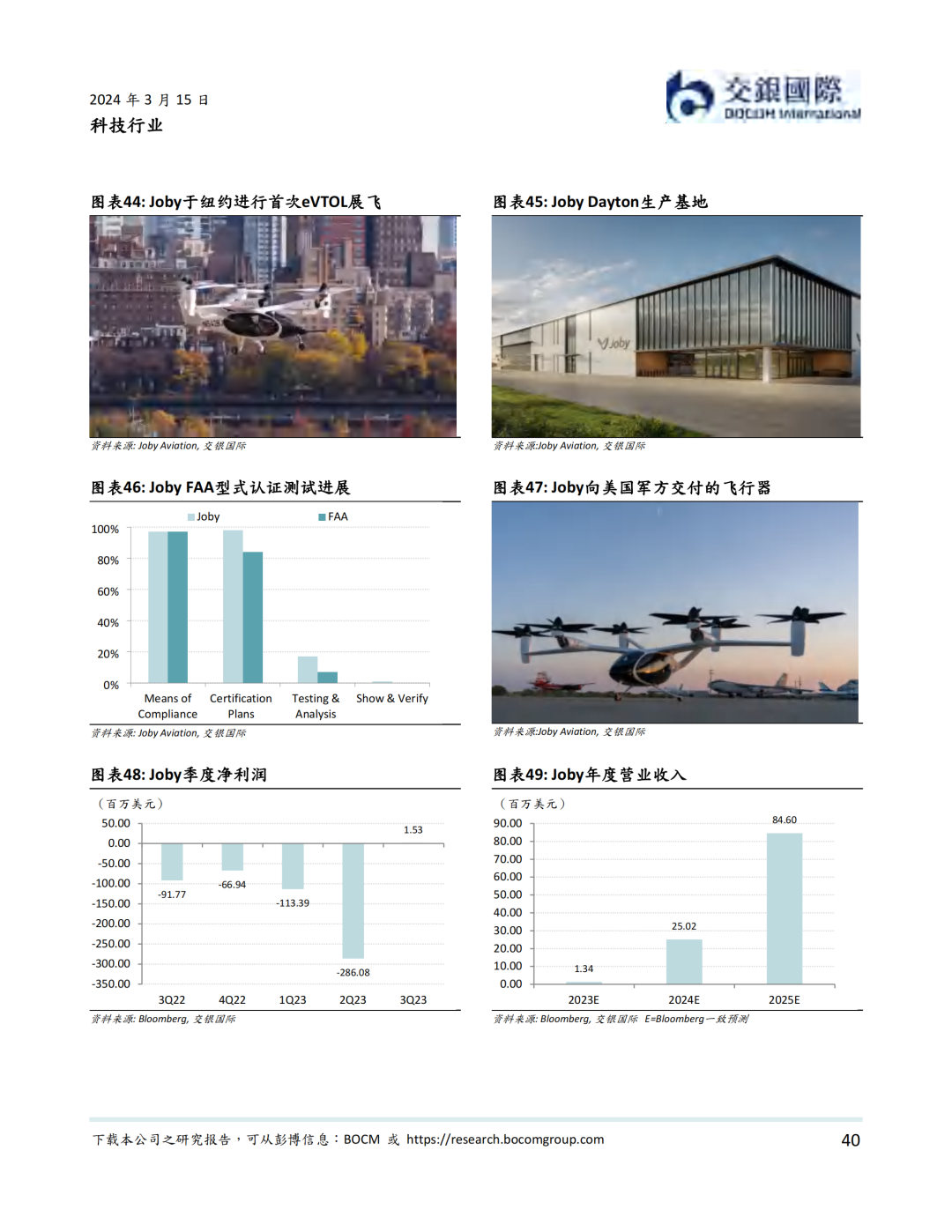 资本市场方面,低空经济以2019年12月内地龙头公司亿航在纽交所上市为里程碑, 近年来一直表现活跃。据我们统计,我国一级市场在2021年到2023年一共完成低空经济融资超过50亿元人民币。截至到2024年3月14日,低空经济航空器公司全球范围内市值不少于81.2亿美元。其中海外公司包括Joby、Lilium、Vertical、Archer、Surf、Eve、Blade Air Mobility等。内地公司则包括亿航智能、中信海直、峰飞航空、时的科技、沃兰特、沃飞长空等初创公司,小鹏汇天等新能源汽车公司,以及大疆等无人机公司。我们认为,虽然大部分低空经济航空器公司目前处于亏损状态,但受益于下游需求增加,部分公司有望在2024-25年扭亏为盈。
