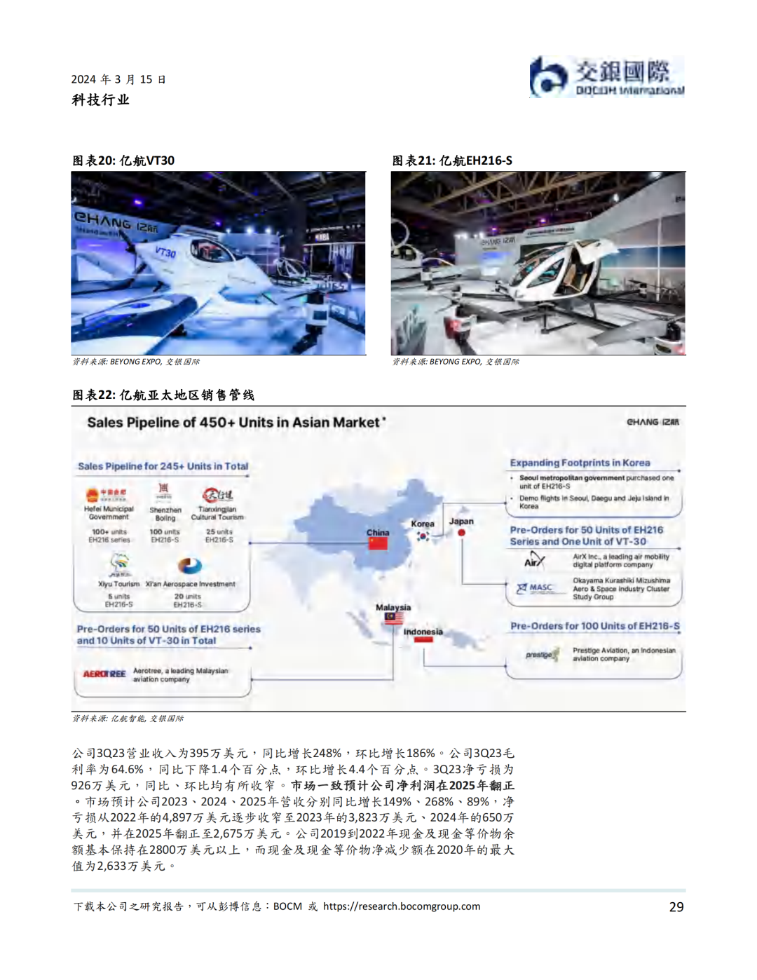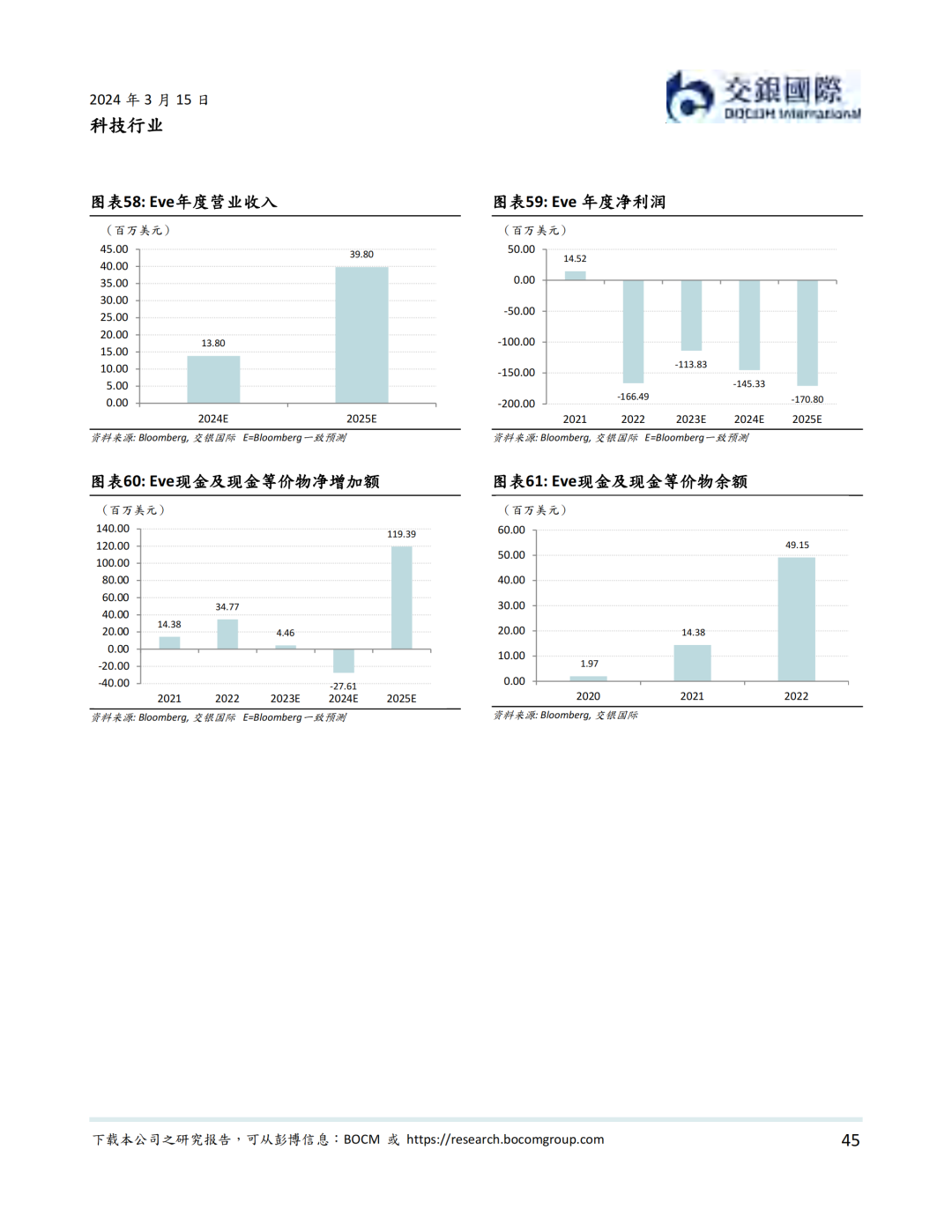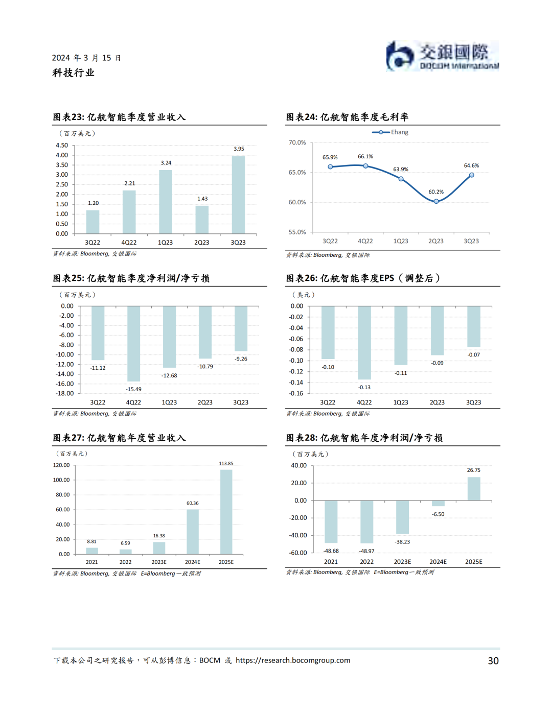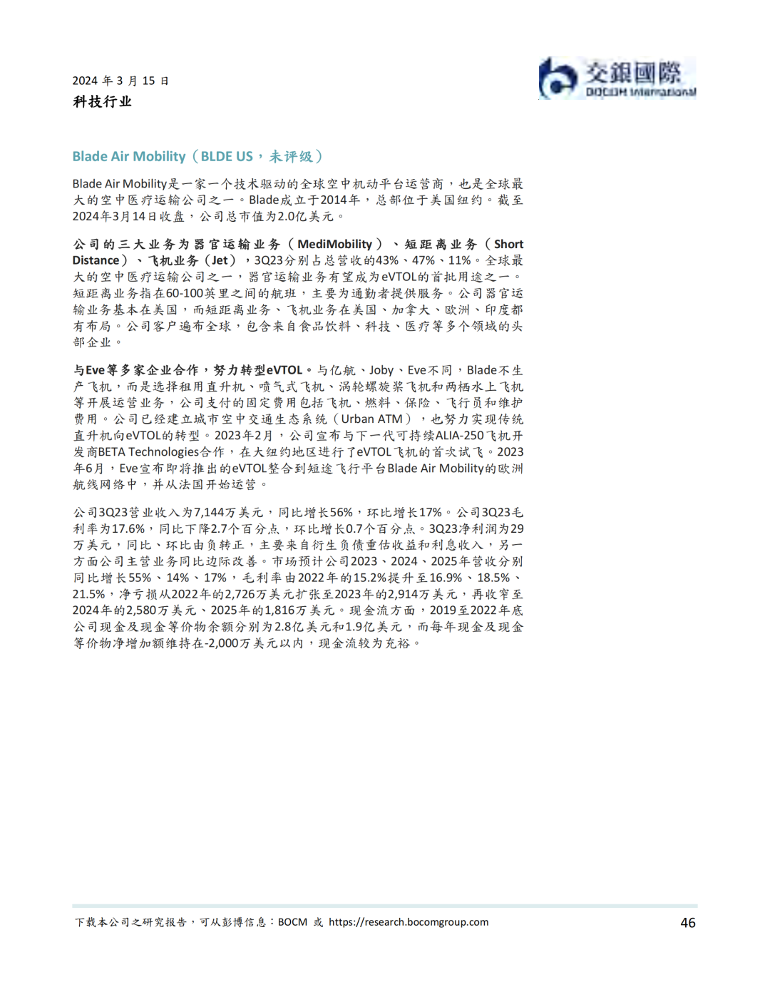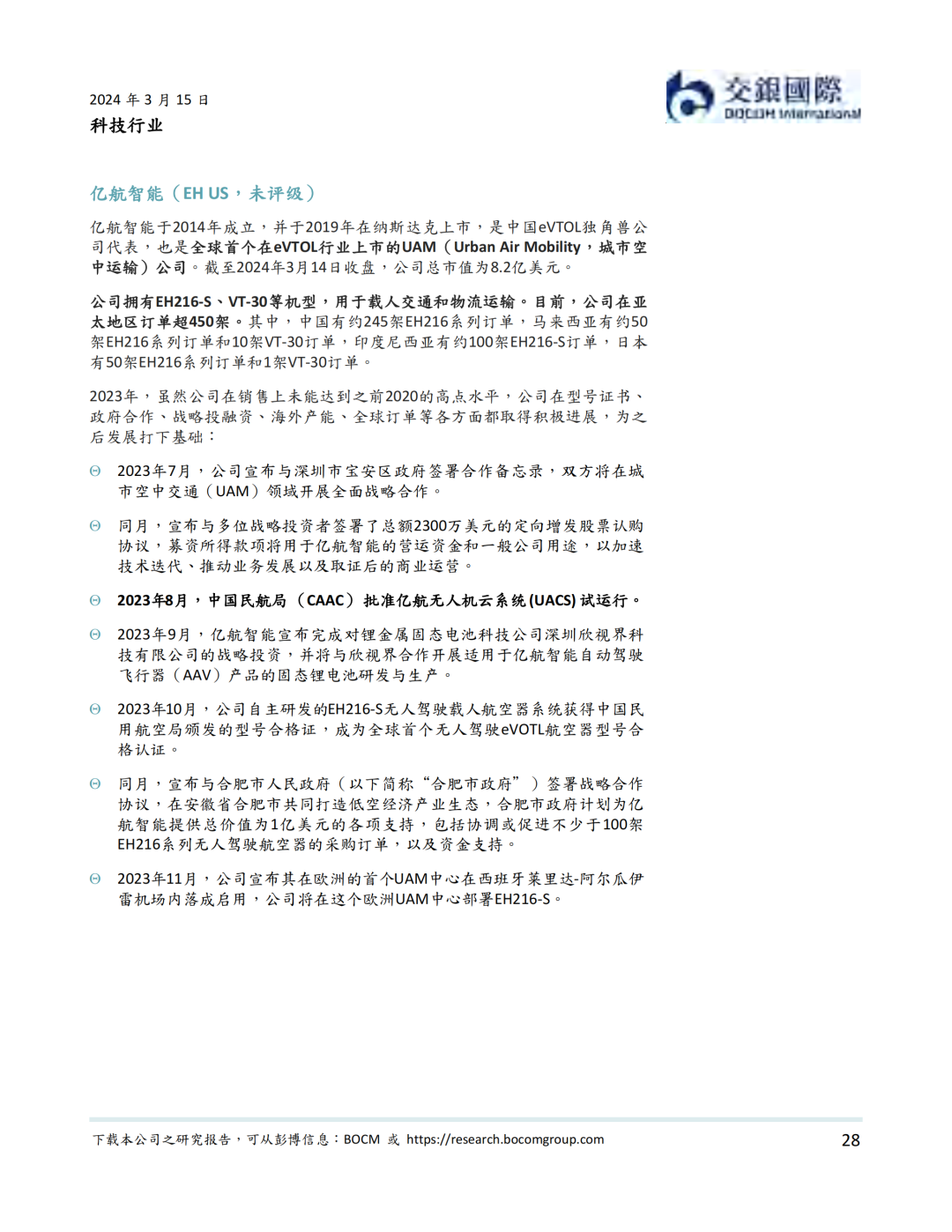 资本市场方面,低空经济以2019年12月内地龙头公司亿航在纽交所上市为里程碑, 近年来一直表现活跃。据我们统计,我国一级市场在2021年到2023年一共完成低空经济融资超过50亿元人民币。截至到2024年3月14日,低空经济航空器公司全球范围内市值不少于81.2亿美元。其中海外公司包括Joby、Lilium、Vertical、Archer、Surf、Eve、Blade Air Mobility等。内地公司则包括亿航智能、中信海直、峰飞航空、时的科技、沃兰特、沃飞长空等初创公司,小鹏汇天等新能源汽车公司,以及大疆等无人机公司。我们认为,虽然大部分低空经济航空器公司目前处于亏损状态,但受益于下游需求增加,部分公司有望在2024-25年扭亏为盈。