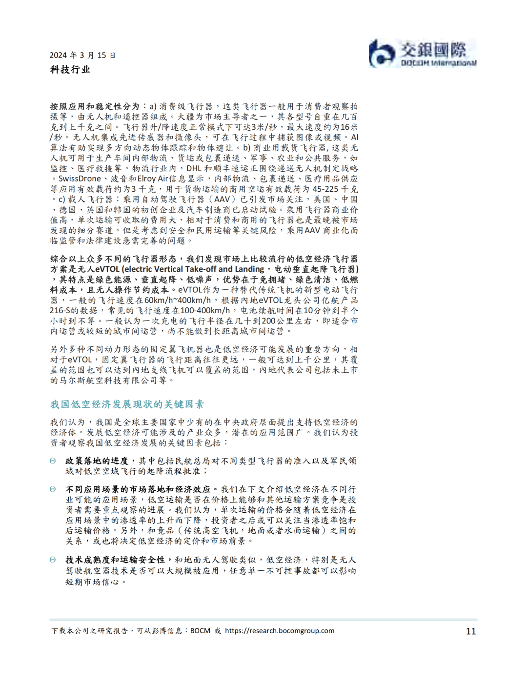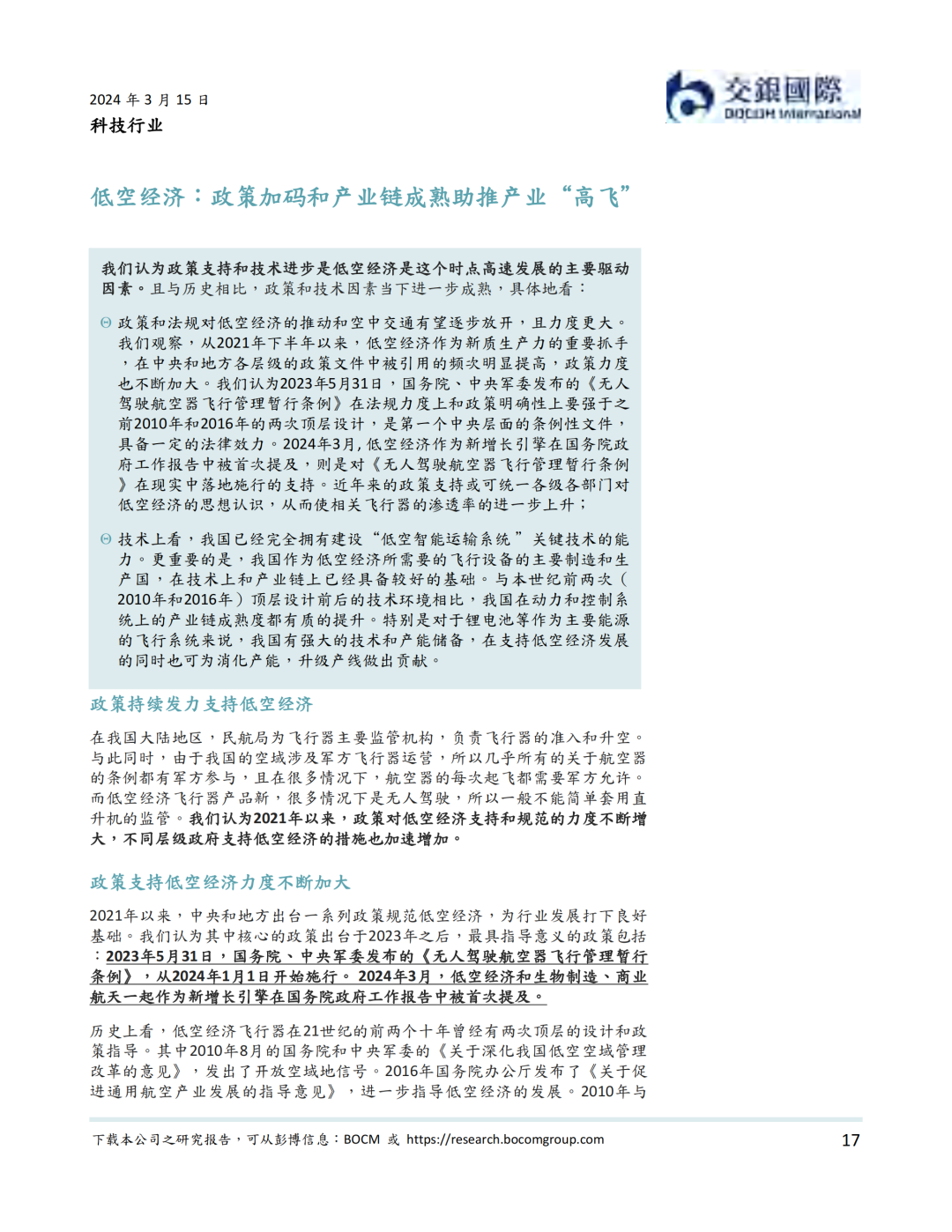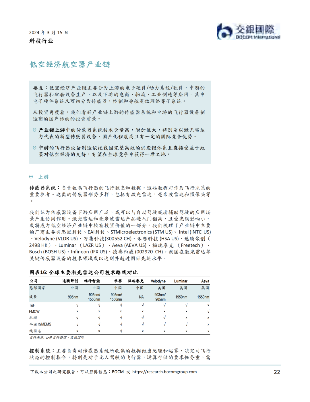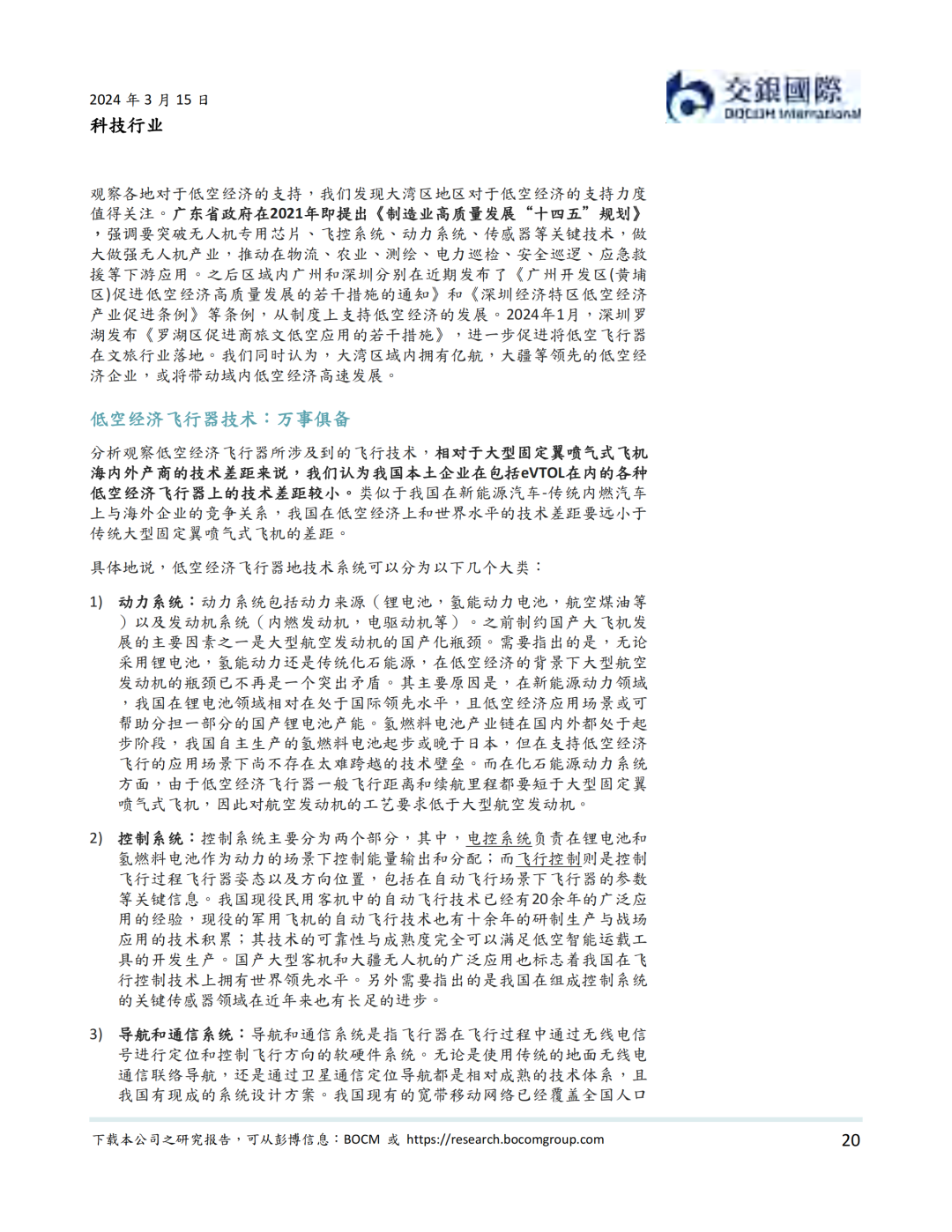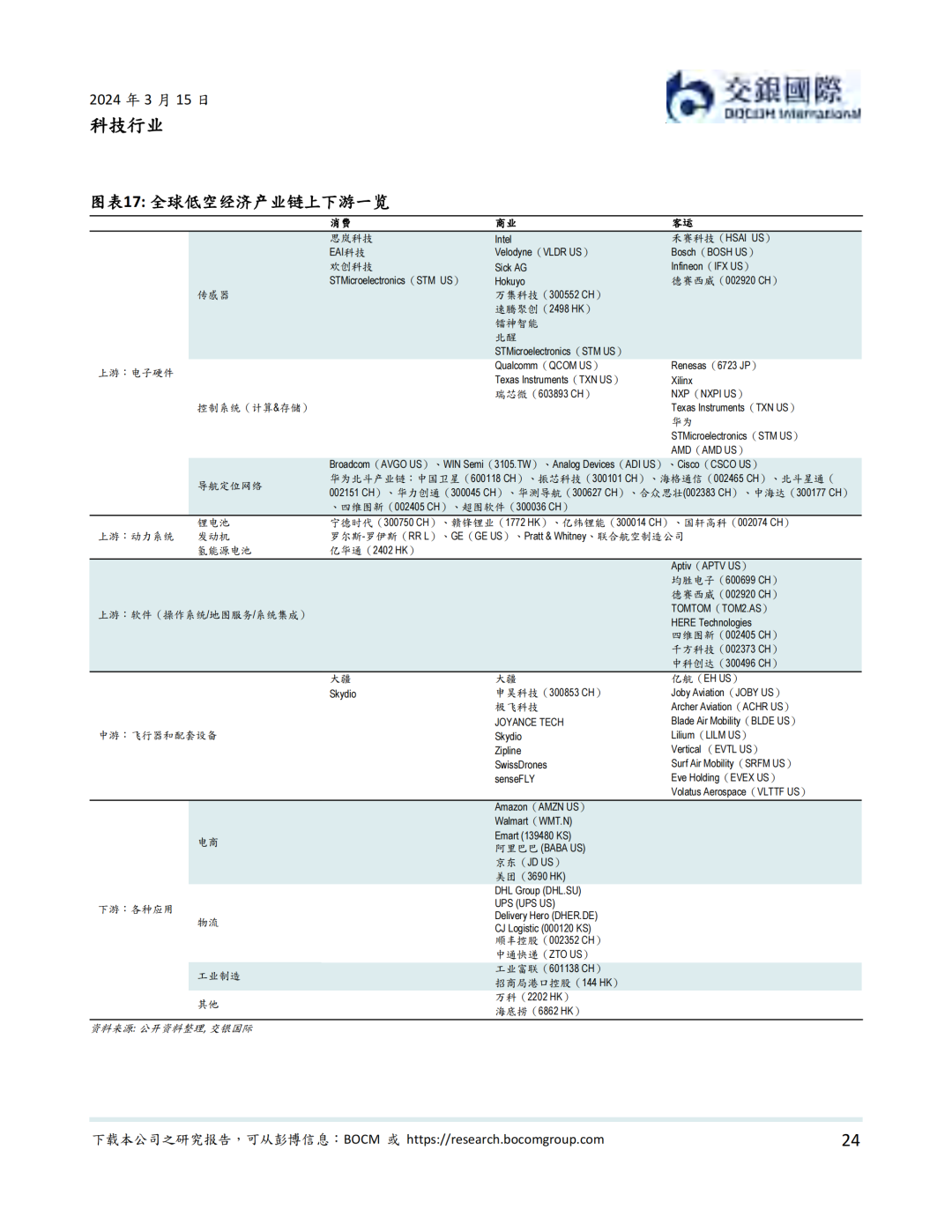 我们认为,政策法规支持和技术进步并完善是低空经济在近期发展的最大驱动力。政策层面,中央和地方密集出台规范低空经济的条例以及支持行业发展的政策。其中,国务院、中央军委发布的《无人驾驶航空器飞行管理暂行条例》从24年1月1日施行。我们认为此条例是低空经济健康发展的基石。技术层面,我国在低空经济技术和产能上与国际先进水平相当,在部分动力系统,控制系统,导航/通信系统,以及飞行机体与机械系统技术上甚至超过海外公司。我们同时看到部分低空经济飞行器公司积极出海的实例。我们梳理了低空经济产业链,我们看好产业链上游的传感器系统和中游的飞行器设备制造商的国产标的的投资前景。