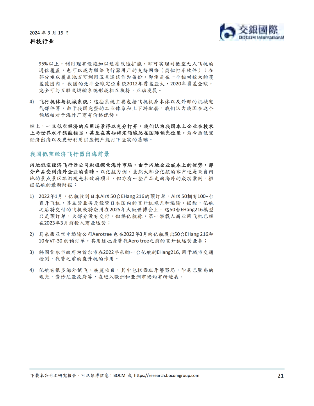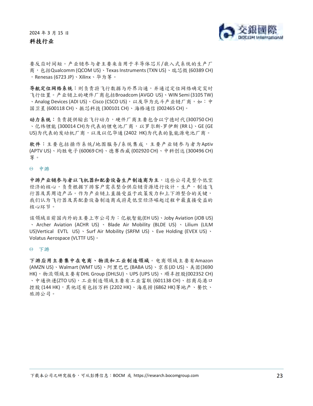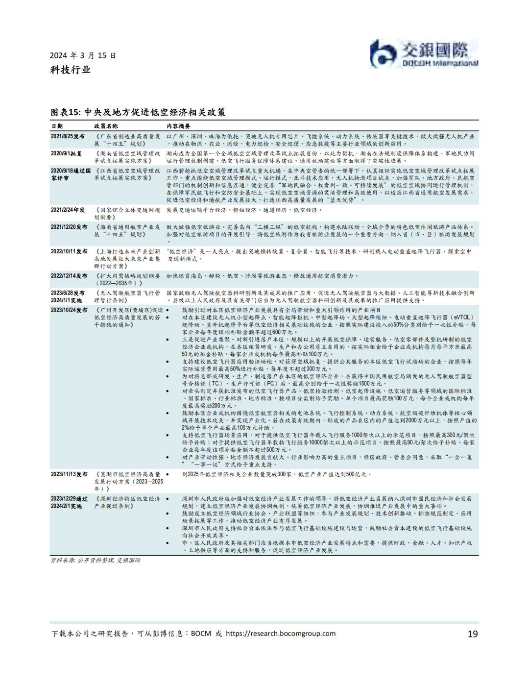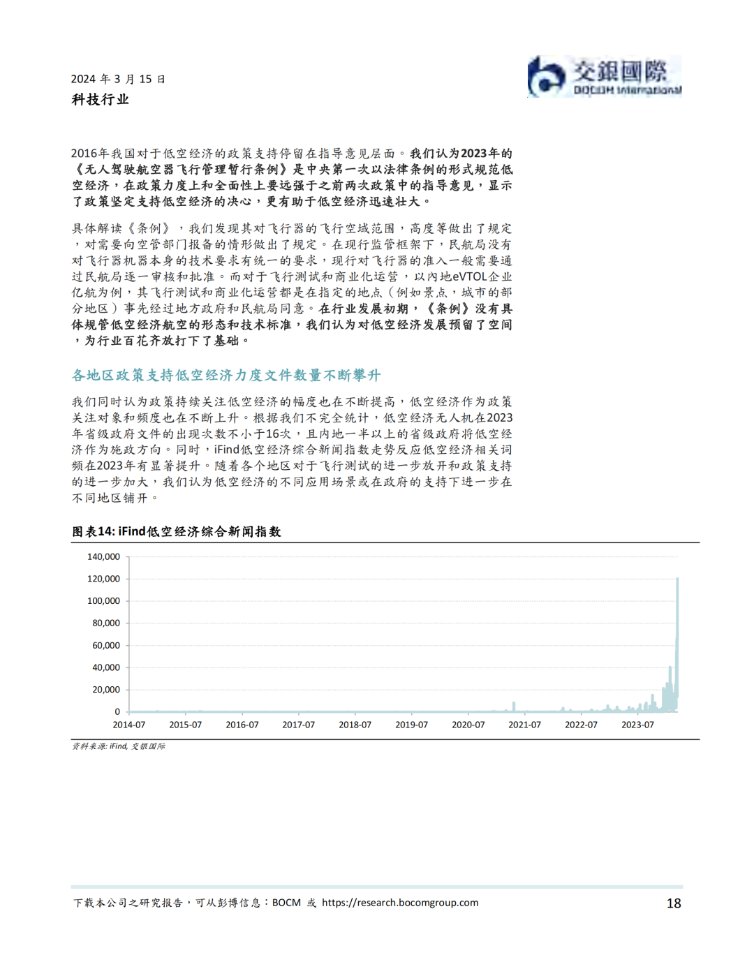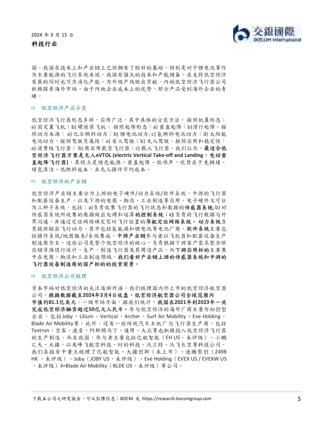 我们认为,政策法规支持和技术进步并完善是低空经济在近期发展的最大驱动力。政策层面,中央和地方密集出台规范低空经济的条例以及支持行业发展的政策。其中,国务院、中央军委发布的《无人驾驶航空器飞行管理暂行条例》从24年1月1日施行。我们认为此条例是低空经济健康发展的基石。技术层面,我国在低空经济技术和产能上与国际先进水平相当,在部分动力系统,控制系统,导航/通信系统,以及飞行机体与机械系统技术上甚至超过海外公司。我们同时看到部分低空经济飞行器公司积极出海的实例。我们梳理了低空经济产业链,我们看好产业链上游的传感器系统和中游的飞行器设备制造商的国产标的的投资前景。