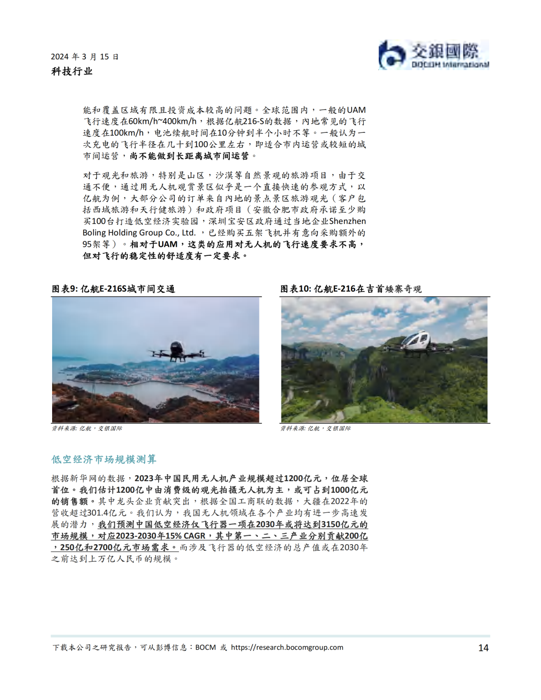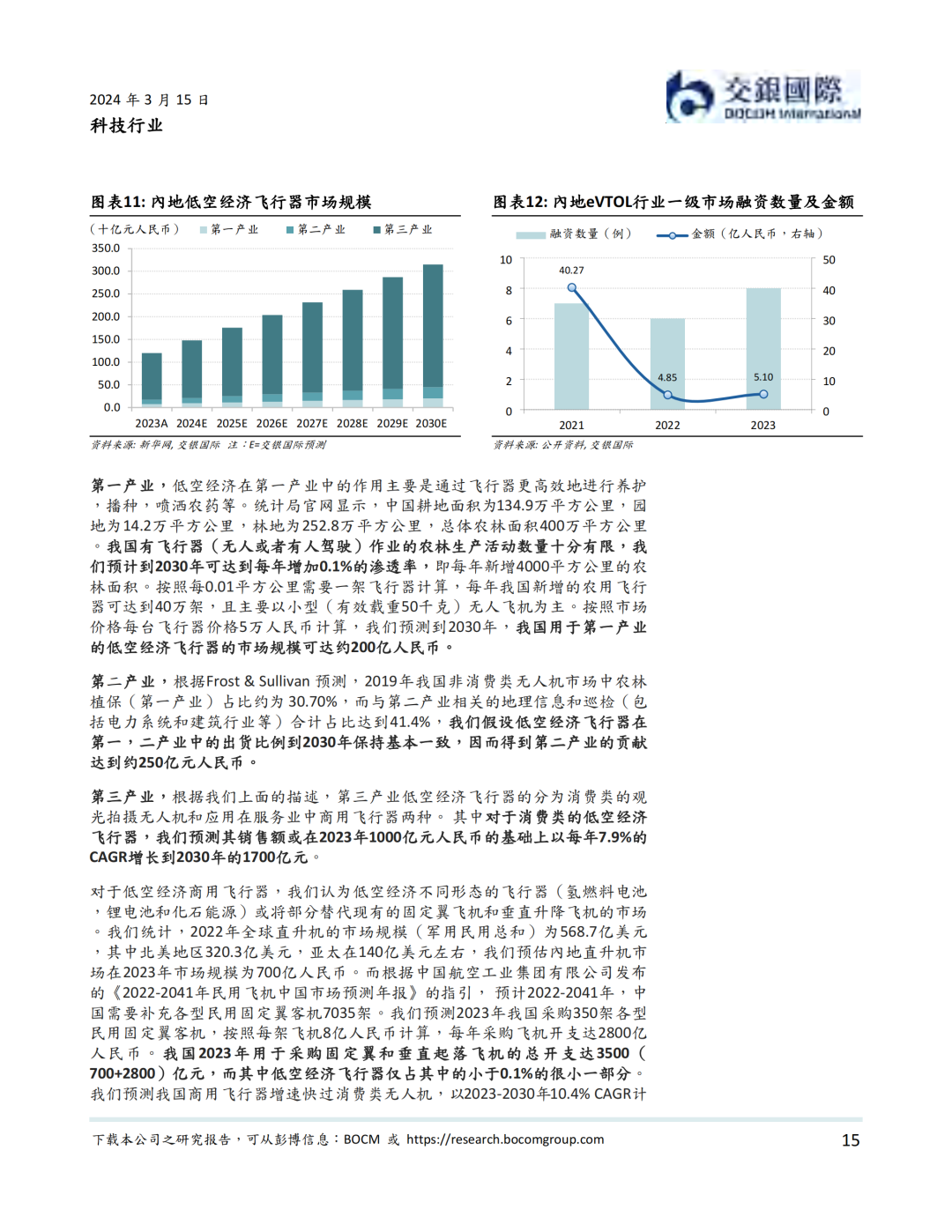 根据新华社数据,我国低空经济中仅无人机在2023年产业规模已超过1200亿元人民币。我们认为低空经济或将继续催生对飞行器的需求,我们预测低空经济飞行器在2030年或将达到3150亿元的市场规模,对应2023-2030年15% CAGR,其中第一、二、三产业分别贡献200,250和2700亿元。而涉及飞行器的低空经济的总产值或在2030年之前达到上万亿人民币的规模。农业方面,低空经济通过飞行器更高效的进行不同形式的林间/田间管理,大大增强农业生产效率,是新质经济在农业领域的最好实践之一。工业与建筑方面,低空经济作业不但能做到提高工程效率,更是保障人员安全的重要手段。在服务业方面,低空经济或将全面应用于运输与观光,承担载货和载人等不同运输目标的各类服务业工作。