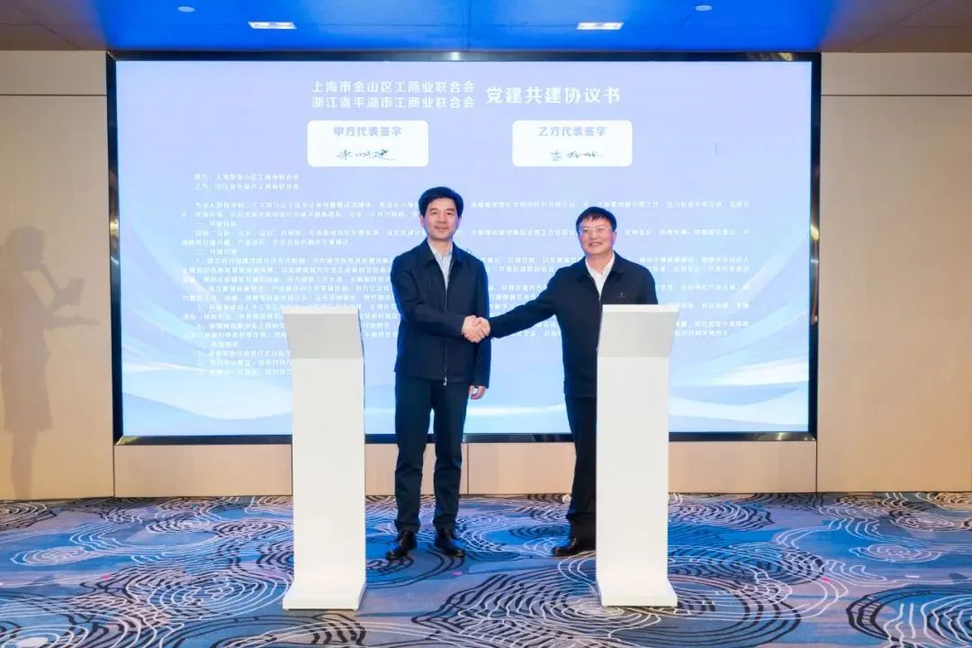 平湖市工商联和金山区工商联两地党组进行现场签约。五镇商会将在毗邻党建引领下,在文化、旅游、产业等方面有更深入的交流和合作,有效推动毗邻商会工作迈上新台阶。