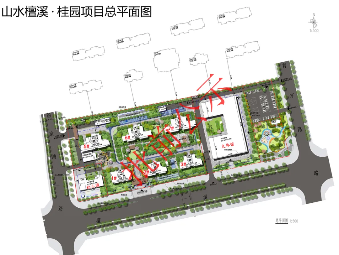 其一为山水檀溪·桂园,项目位于檀溪路以北、育才路以西、汤家湾路以东。为首次取证,此次取得预售的是1#、2#、3#、5#、6#、7#楼,共批得住宅预售面积63555.03㎡,已于4月27日开盘。