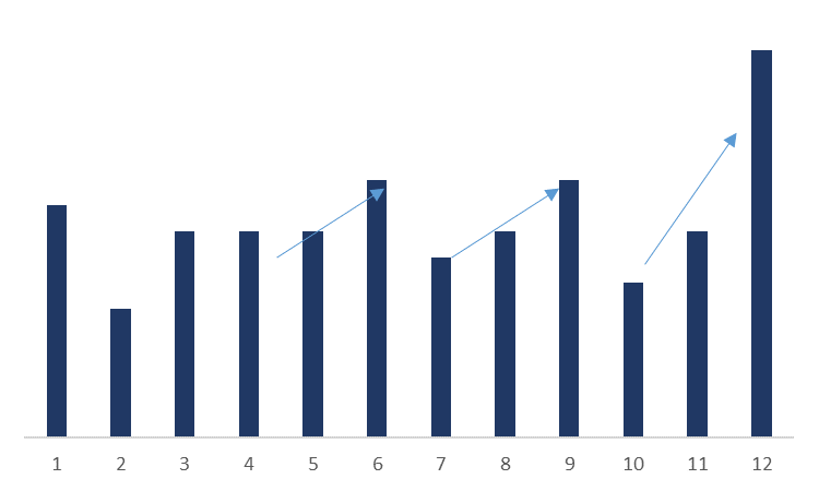 各家为了达成Q1的业绩,想必有的企业压了很多的货吧,我们模拟各个厂家的业绩情况(如有巧合纯属雷同)大部分都是按照这样的模式,季度末压货,年中压货,年末压货。