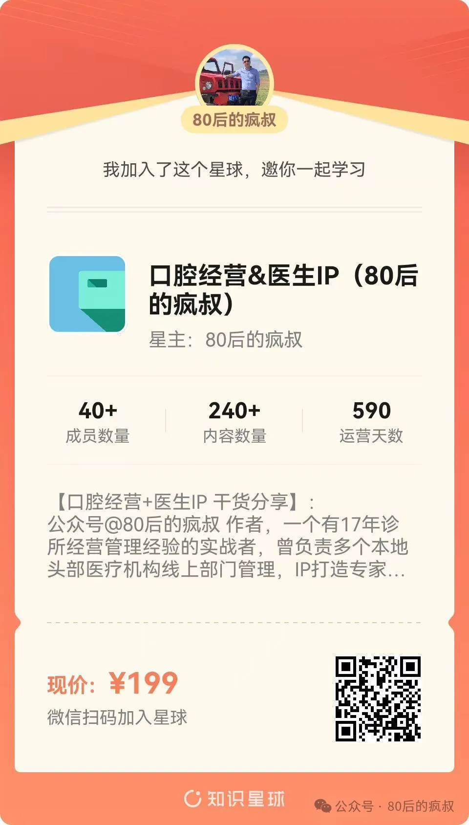 疯叔建议大家加入 “知识星球”的付费口腔经营和IP打造的圈子,可以每天阅读到更多的干货,认识更多的口腔同行。(扫一扫以下海报二维码支付199元即可直接加入)