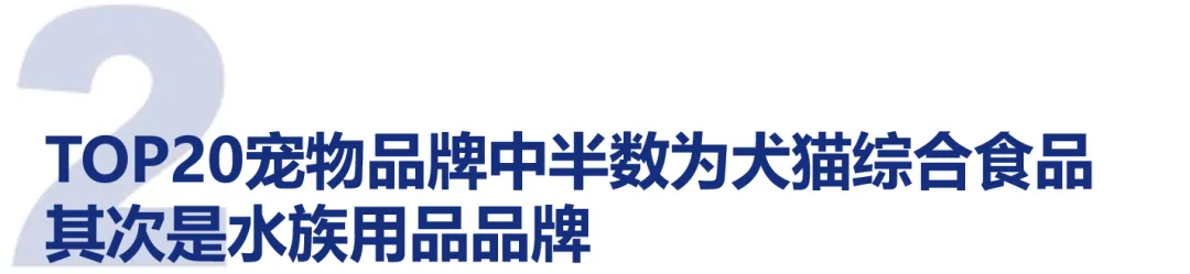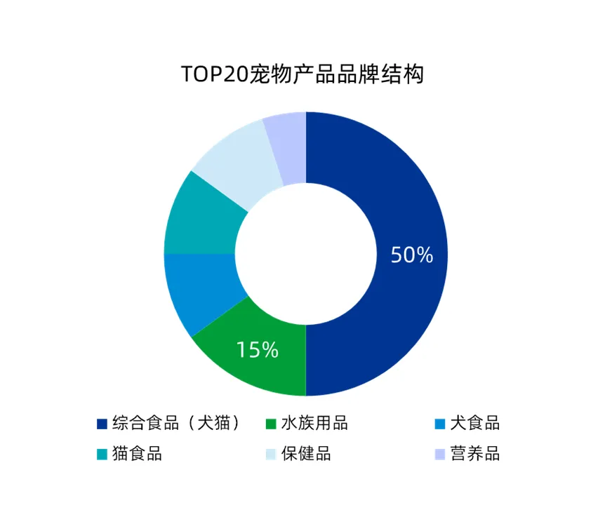 从品类来看,行业TOP20品牌中半数为综合犬猫食品品牌,其次是水族用品品牌占比15%,犬食品、猫食品、保健品(驱虫产品)品牌各占比10%,营养品品牌占比5%。