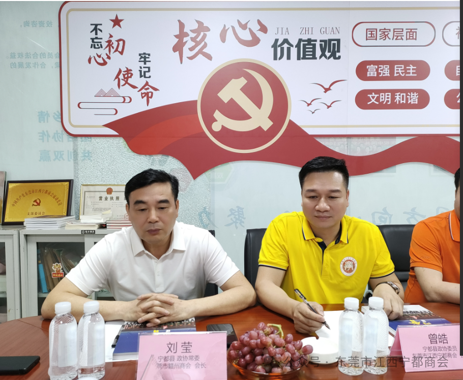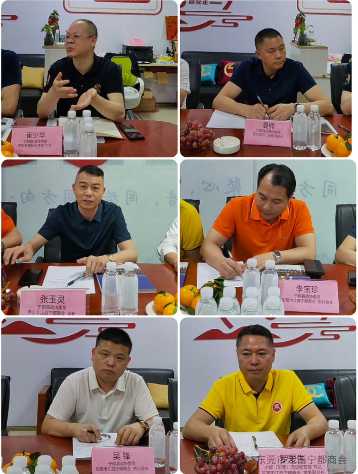 宁都县政协副主席/宁都县工商联(总商会)主席(会长) 李强,宁都县政协常委、县政协经济委主任 崔少华,宁都县交通运输局党组成员、运管所所长 夏楠,宁都县政协常委/东莞市赣州商会会长 刘莹,宁都县政协委员/东莞市江西宁都商会会长 曾皓,县政协委员/佛山市江西宁都商会会长 张玉灵,县政协委员/东莞市江西宁都商会执行会长:李宝珍、吴锋,宁都县(东莞)流动党支部书记罗爱生,宁都县政协委员/广州市江西宁都商会常务副会长温平生及秘书处代表等参加了会议。