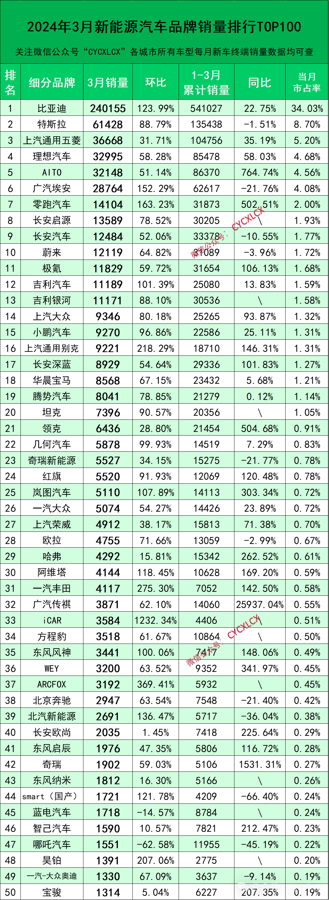 2024年3月新能源汽车细分品牌终端零售销量排行出炉:排名前十名的细分品牌依次为:比亚迪、特斯拉、上汽通用五菱、理想汽车、AITO、广汽埃安、零跑汽车、长安启源、长安汽车、蔚来;